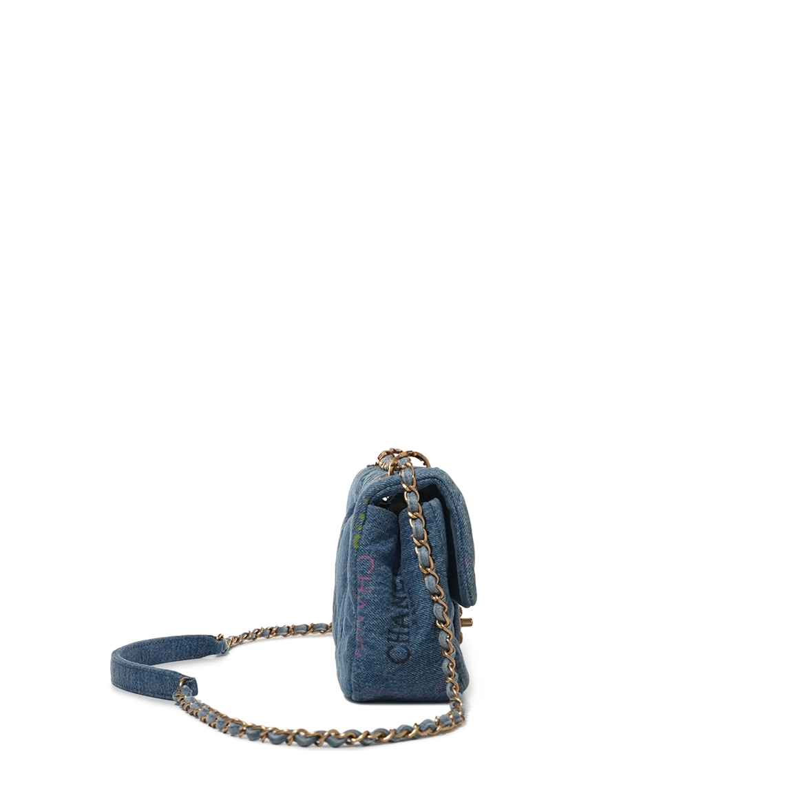 Blue Quilted Denim Flap Bag Brushed Gold Hardware