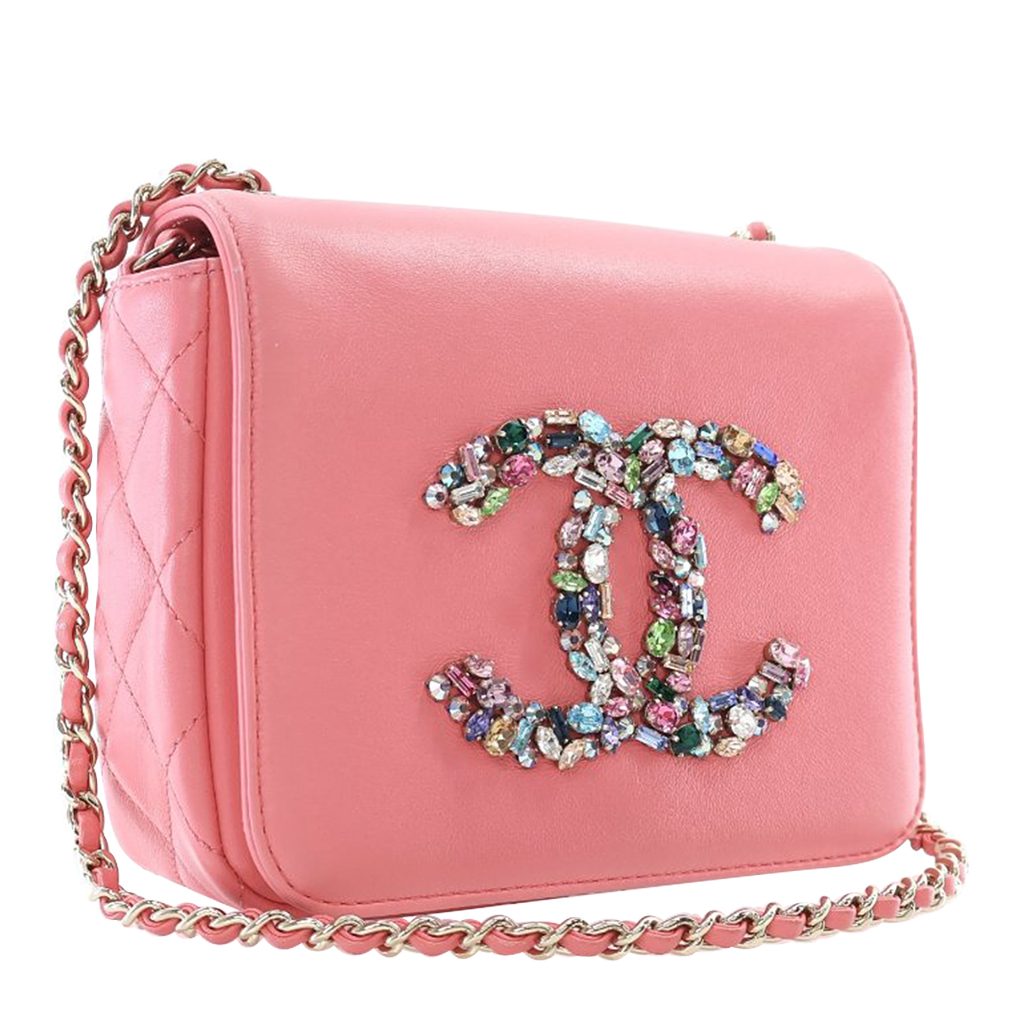 Pink Lambskin Giant Crystal CC Mini Flap Bag Gold Hardware, 2021