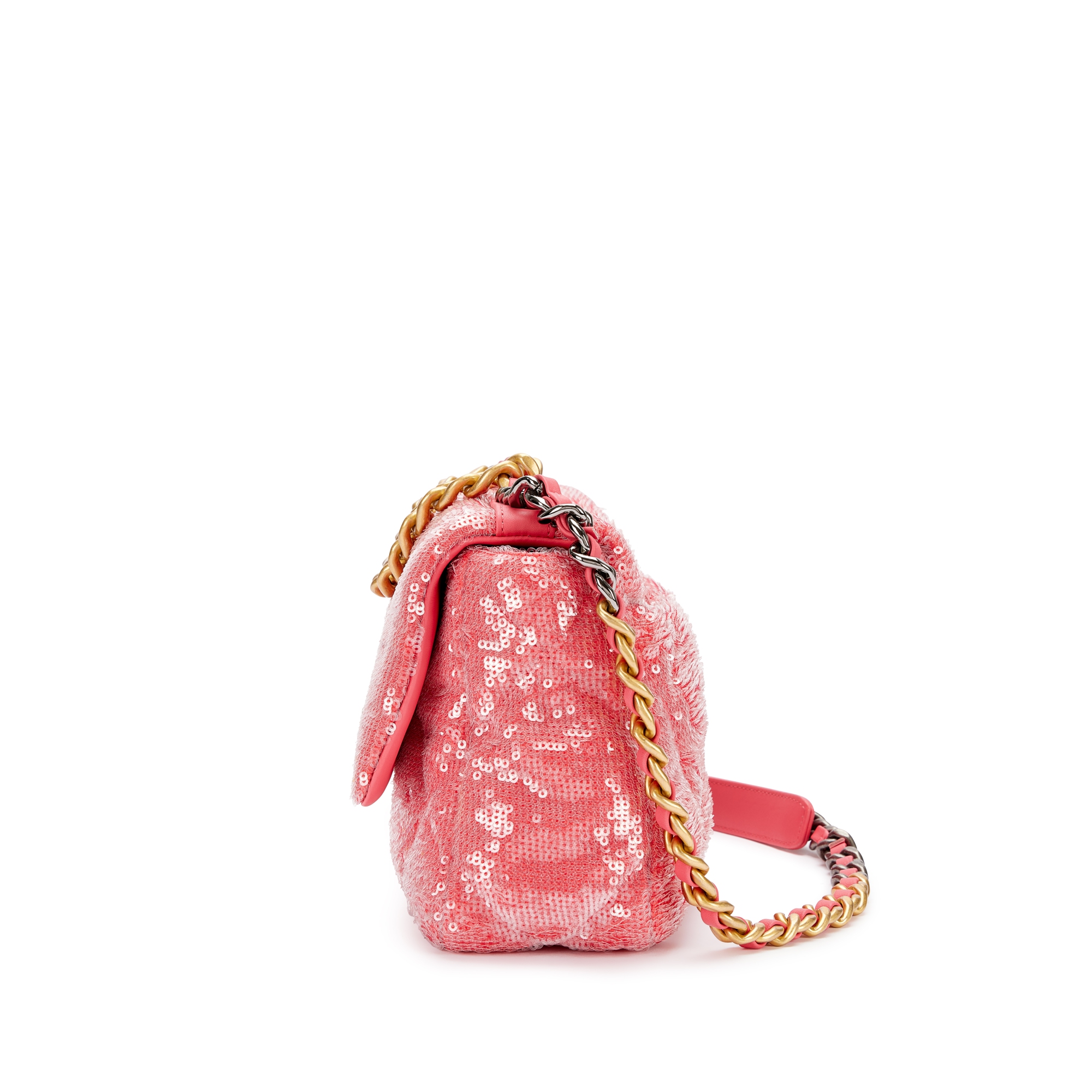 Pink Quilted Sequin Chanel 19 Flap Brushed Gold, Silver and Ruthenium Hardware, 2020