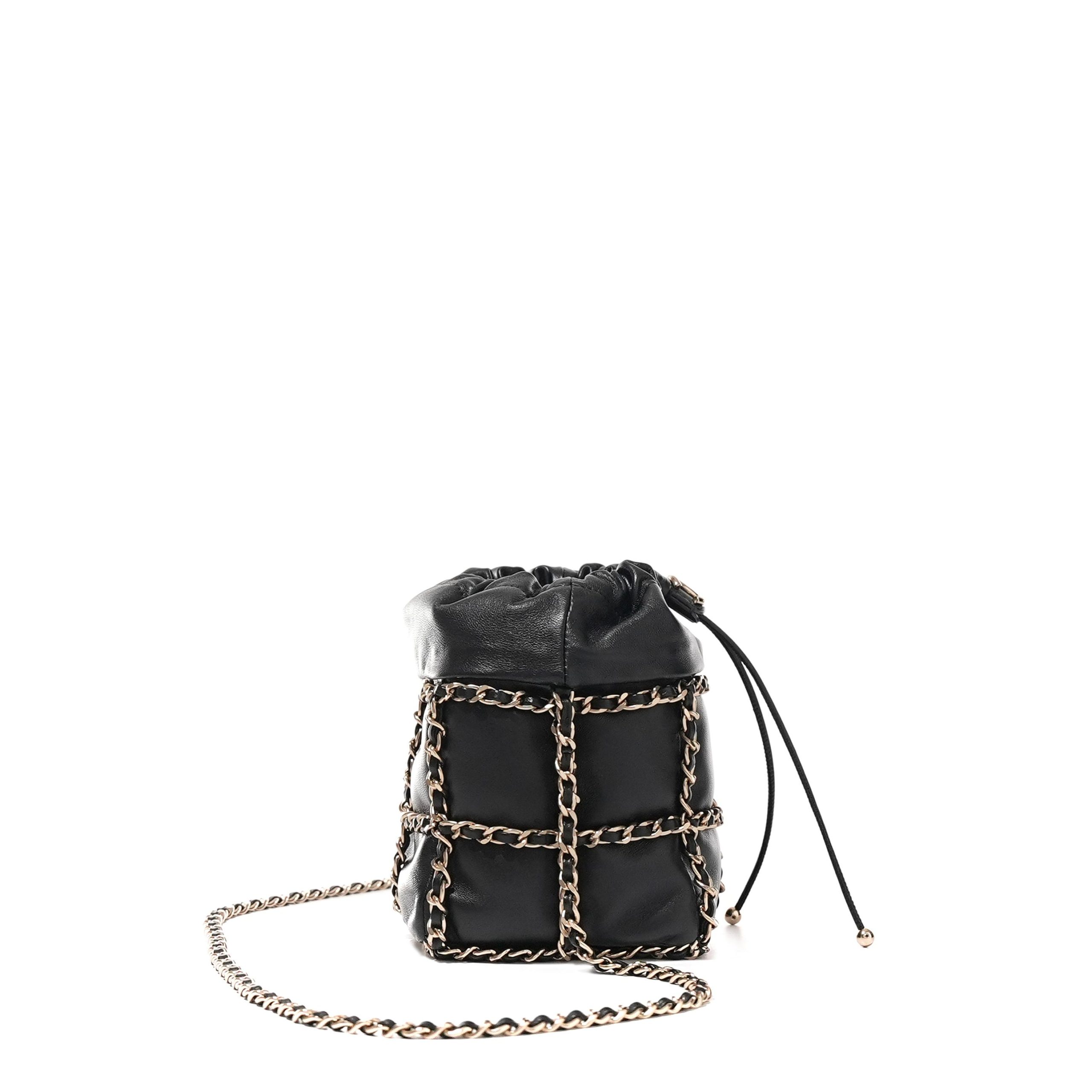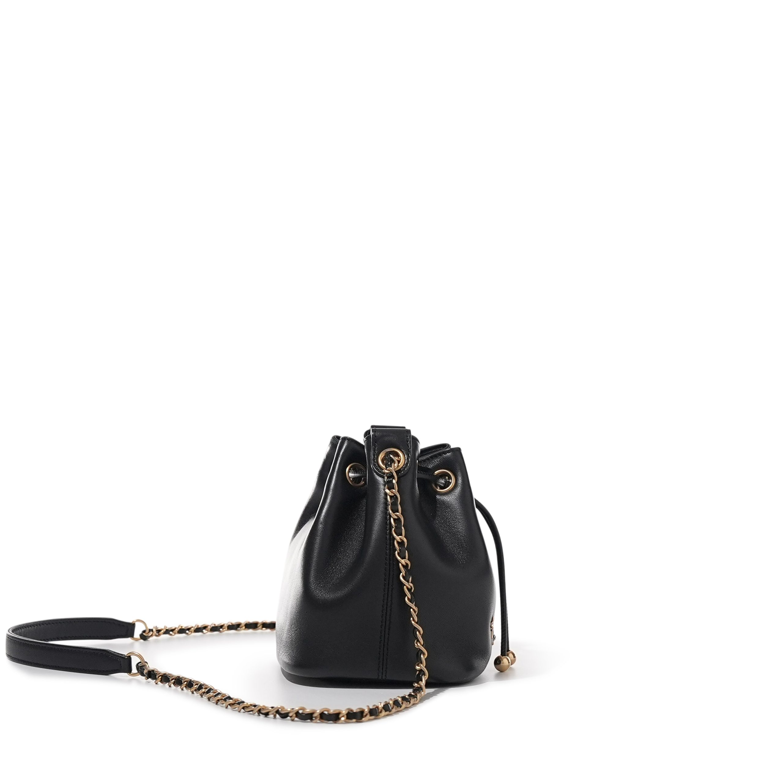 Black Lambskin Chain Drawstring Bucket Bag Pale Gold Hardware, 2021