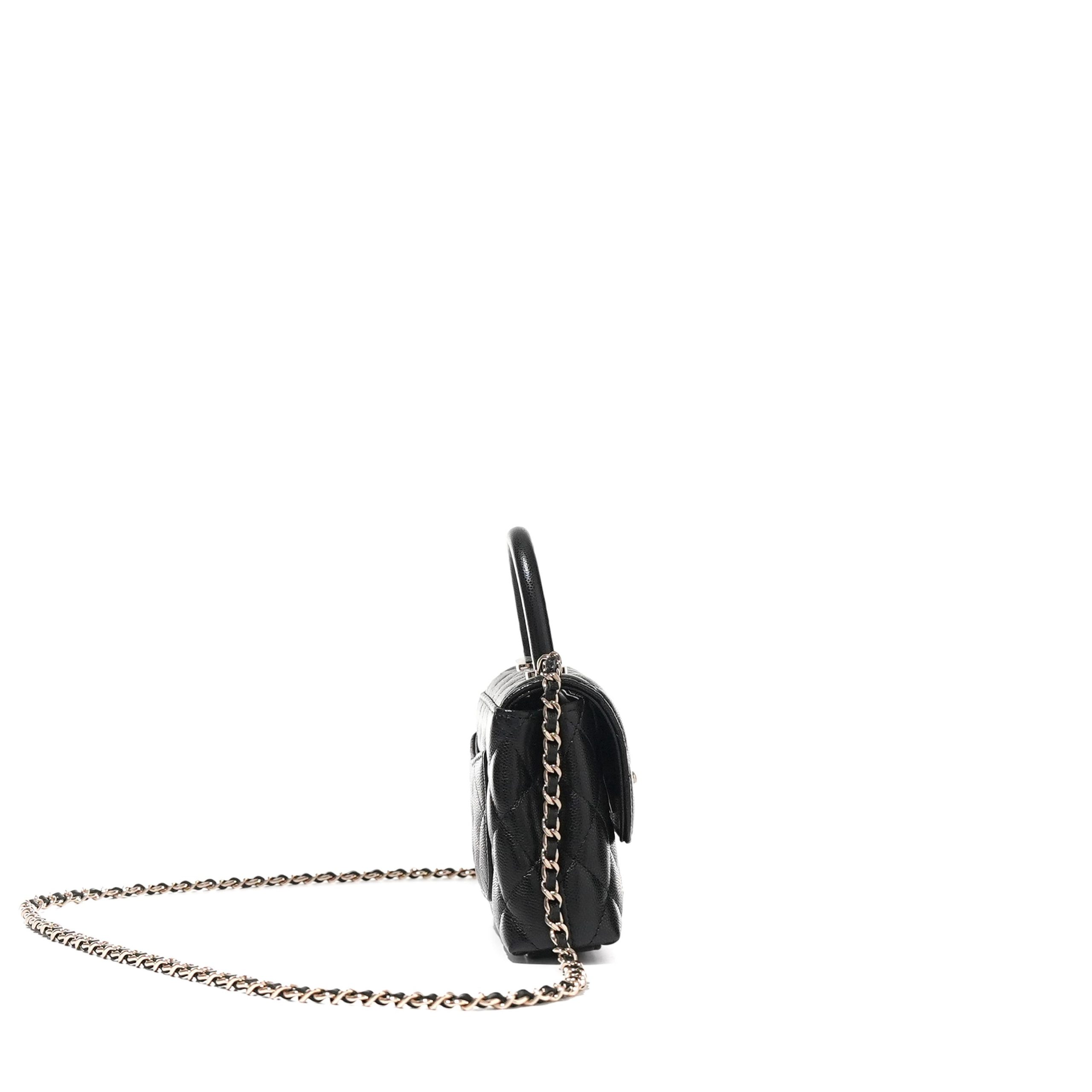 Black Quilted Caviar Top Handle Flap Bag with Chain Pale Gold Hardware