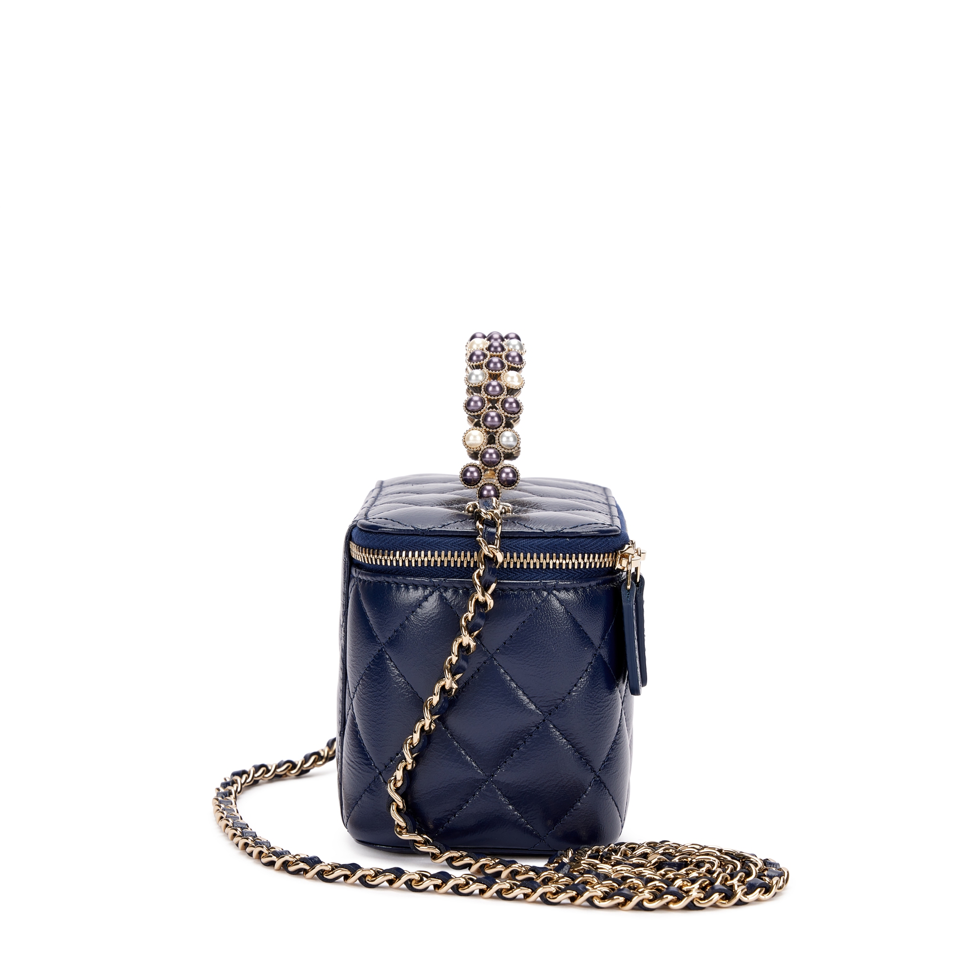 Navy Quilted Aged Calfskin and Imitation Pearl Top Handle Vanity Case Pale Gold Hardware