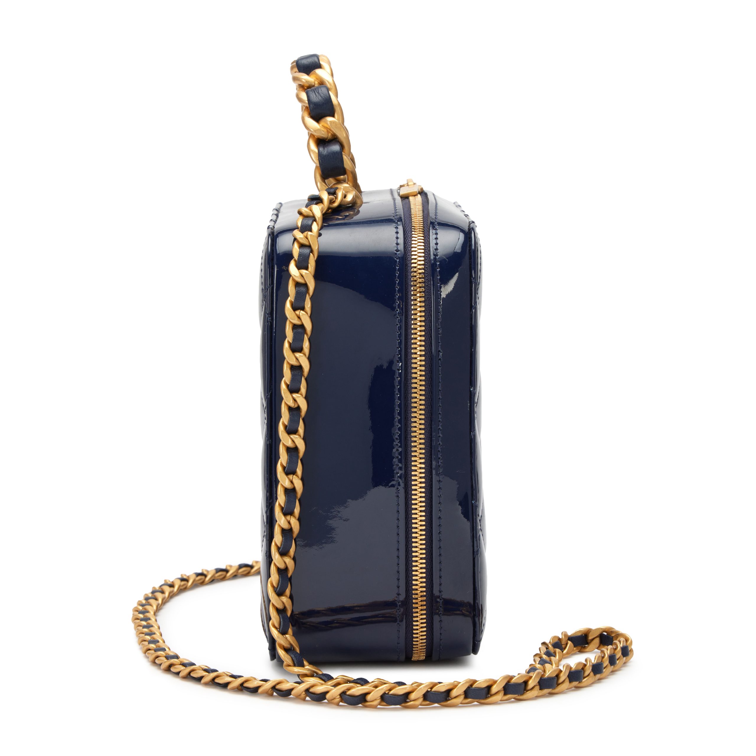 Navy Blue Patent Quilted Top Handle Vanity Case Aged Gold Hardware, 2022