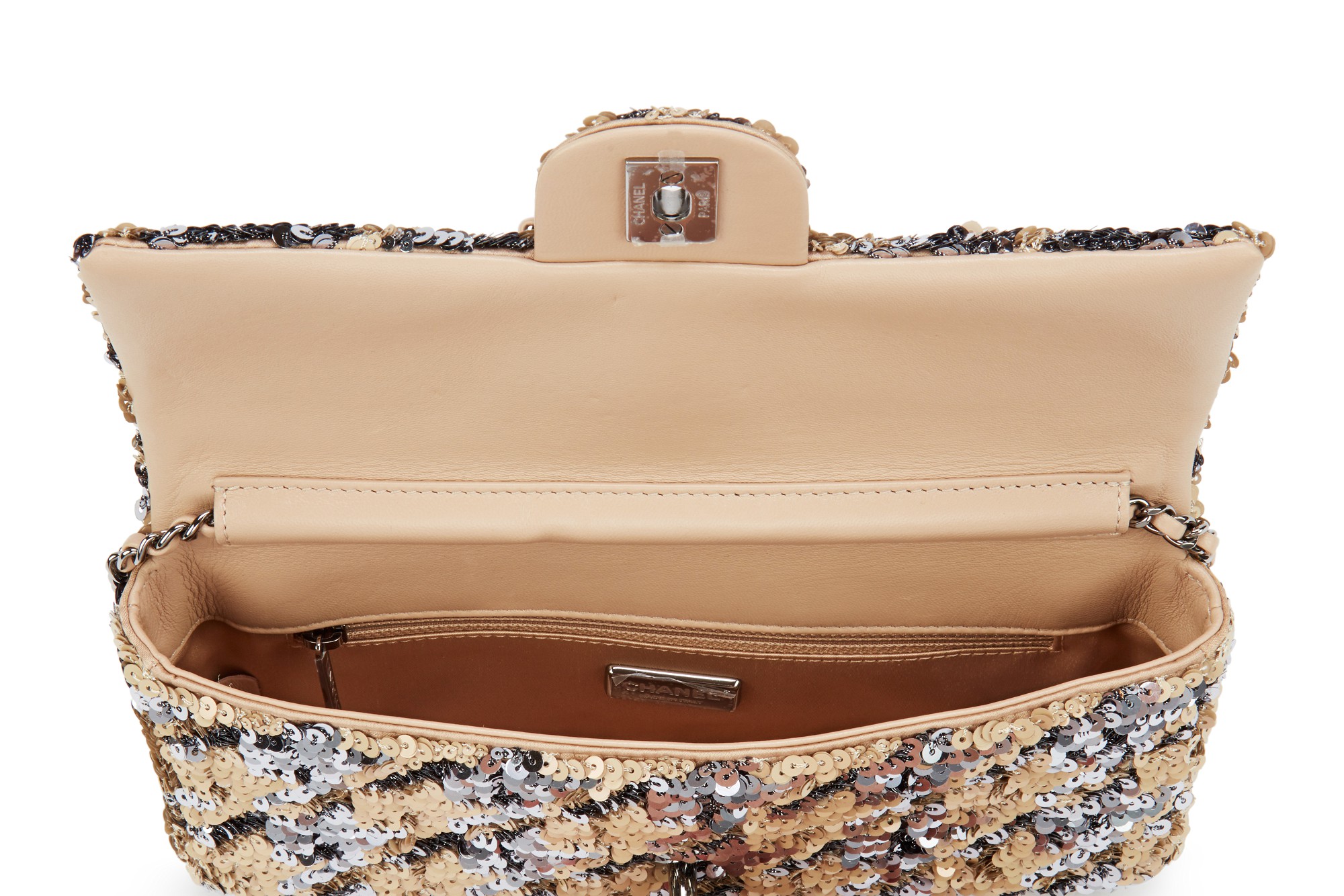 Chanel Beige and Gray Sequin and Lambskin East/West Single Flap Ruthenium Hardware, 2020The interior is lined in beige satin and lambskinIncludes authenticity card, dustbag, large care card, ribbon, camellia, and boxThis item is final sale