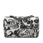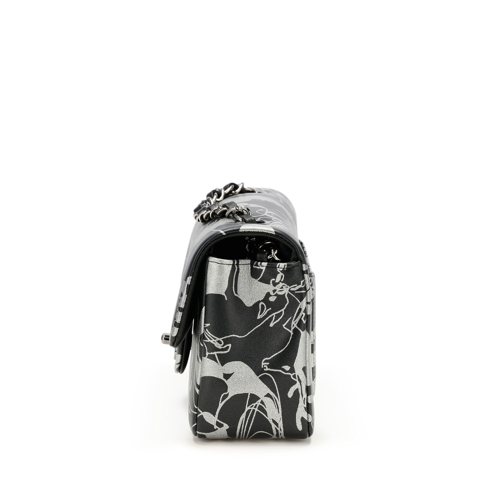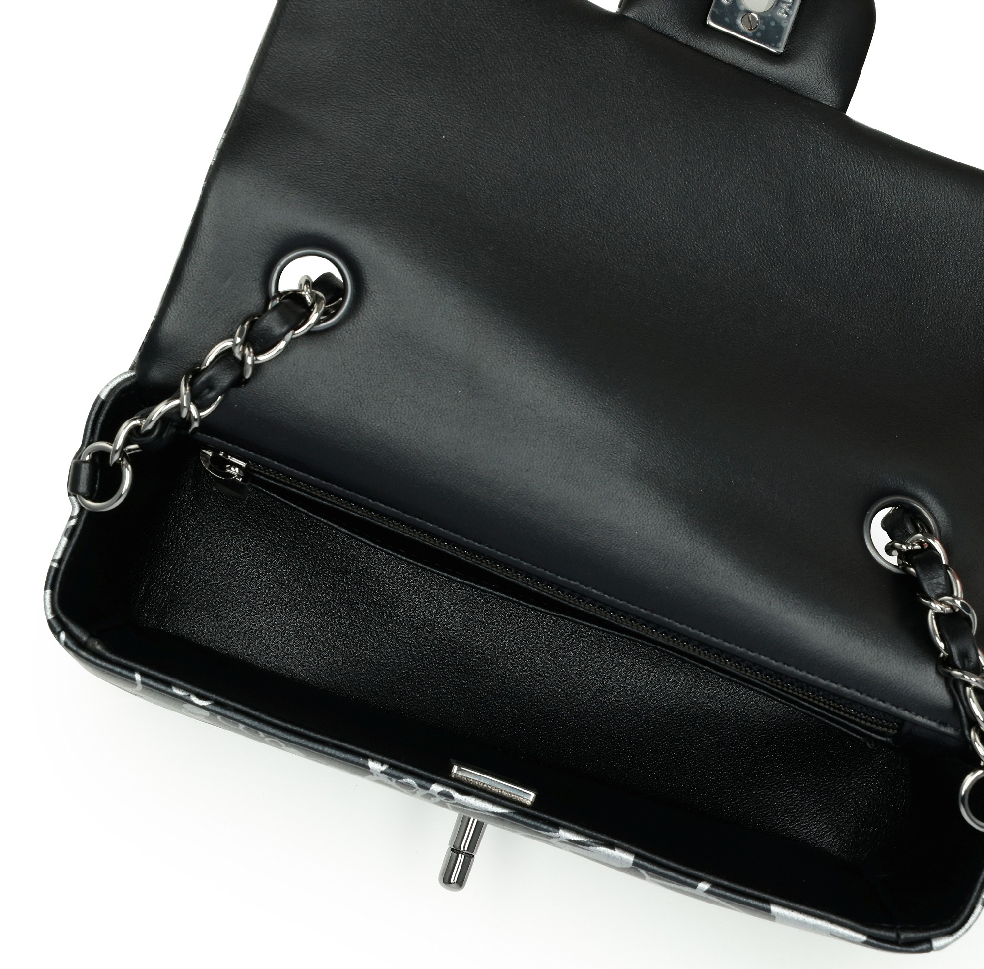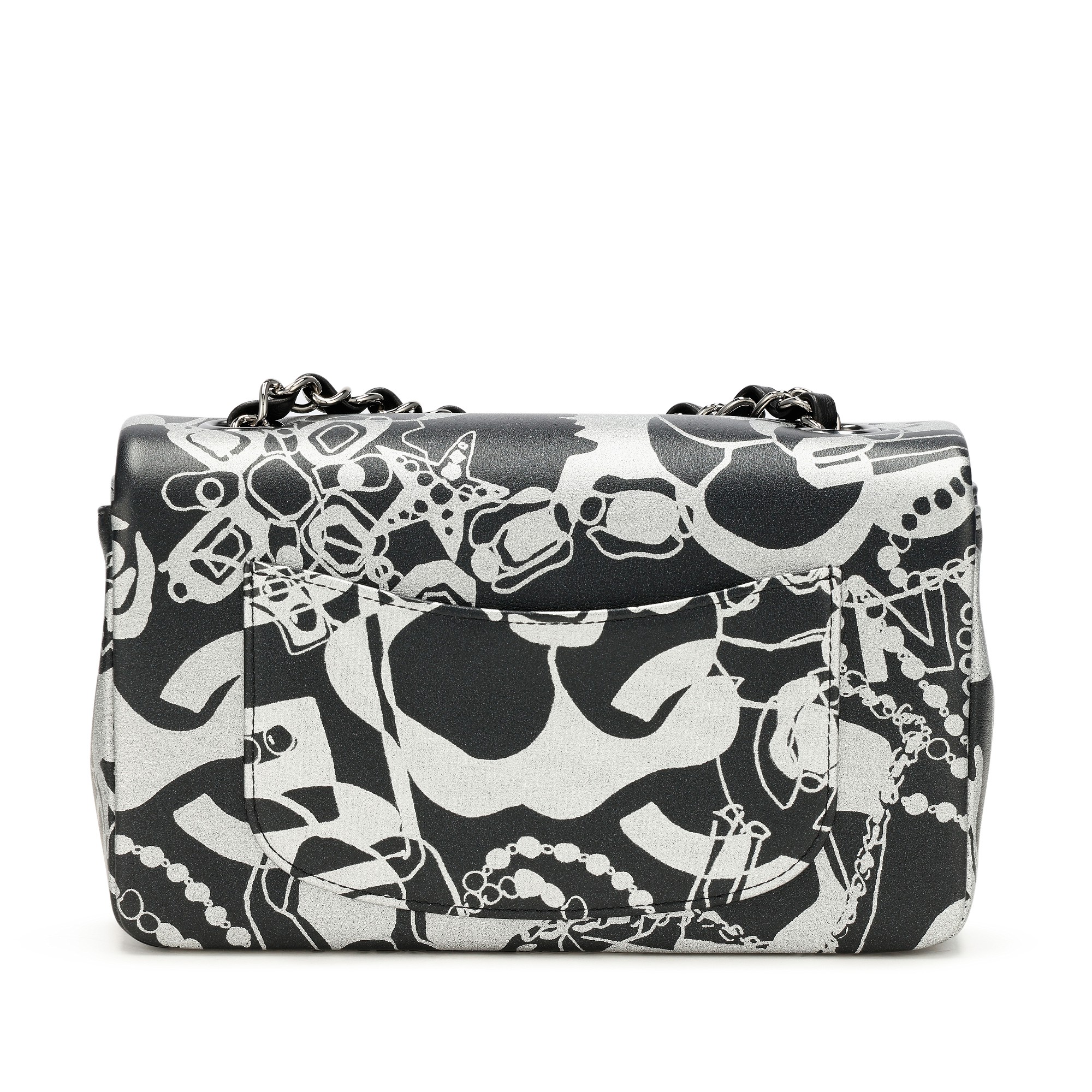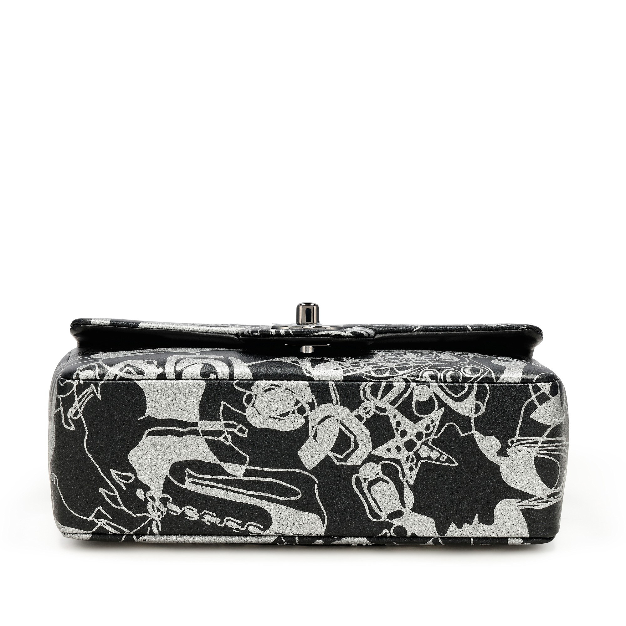 Chanel Black and Silver Printed Lambskin Mini Classic Flap Ruthenium Hardware, 2022This bag is lined with black leatherIncludes care booklet, dustbag, and boxThis item is final sale