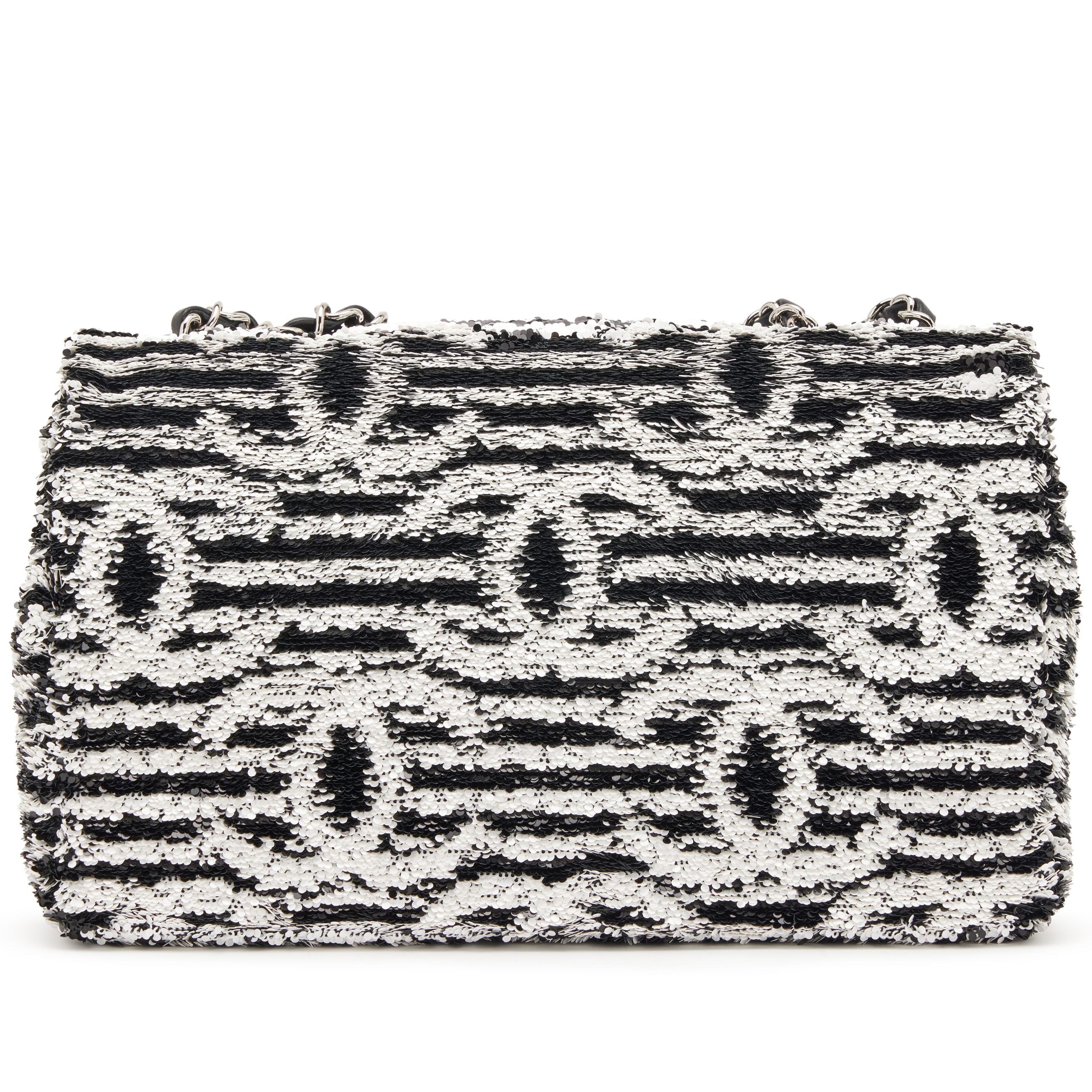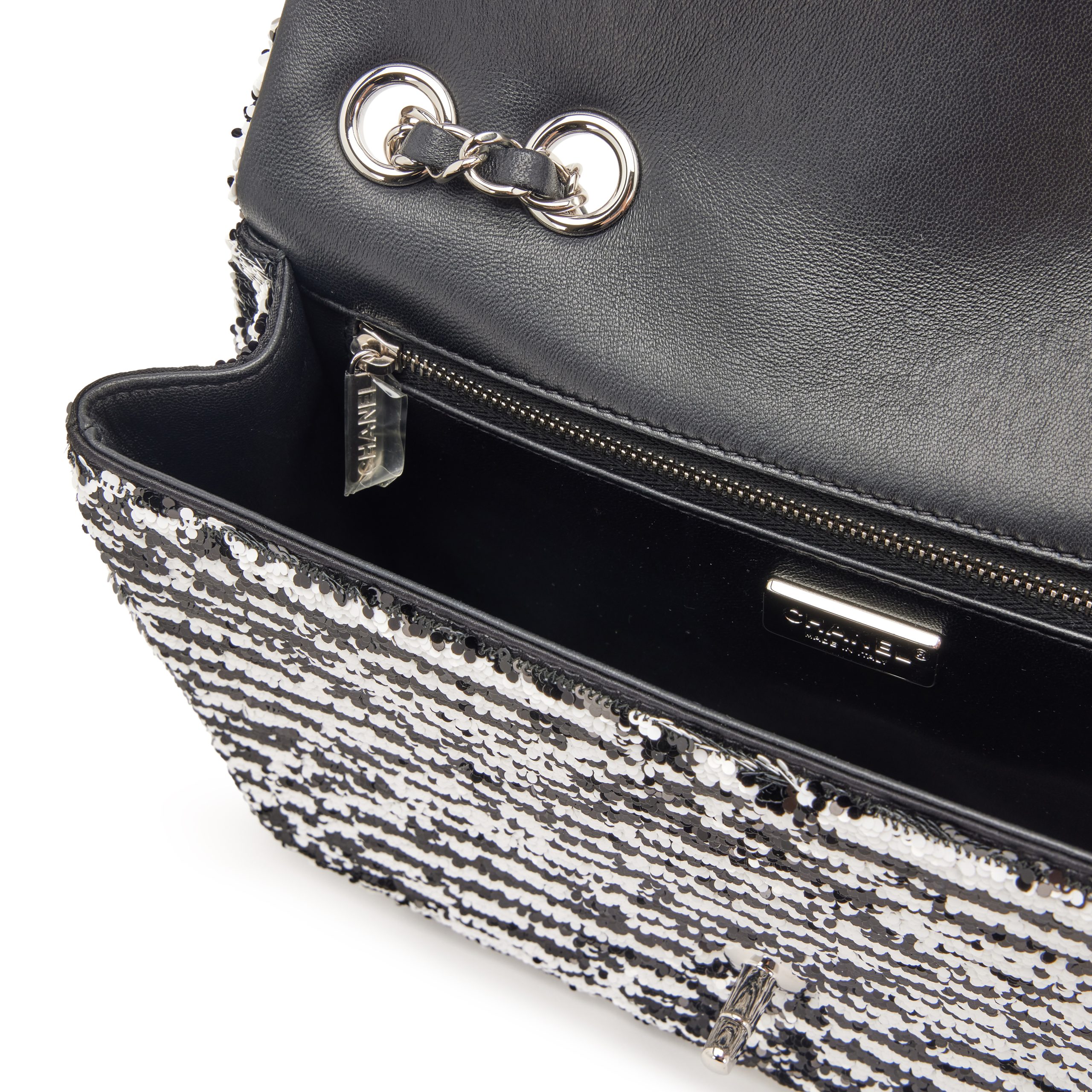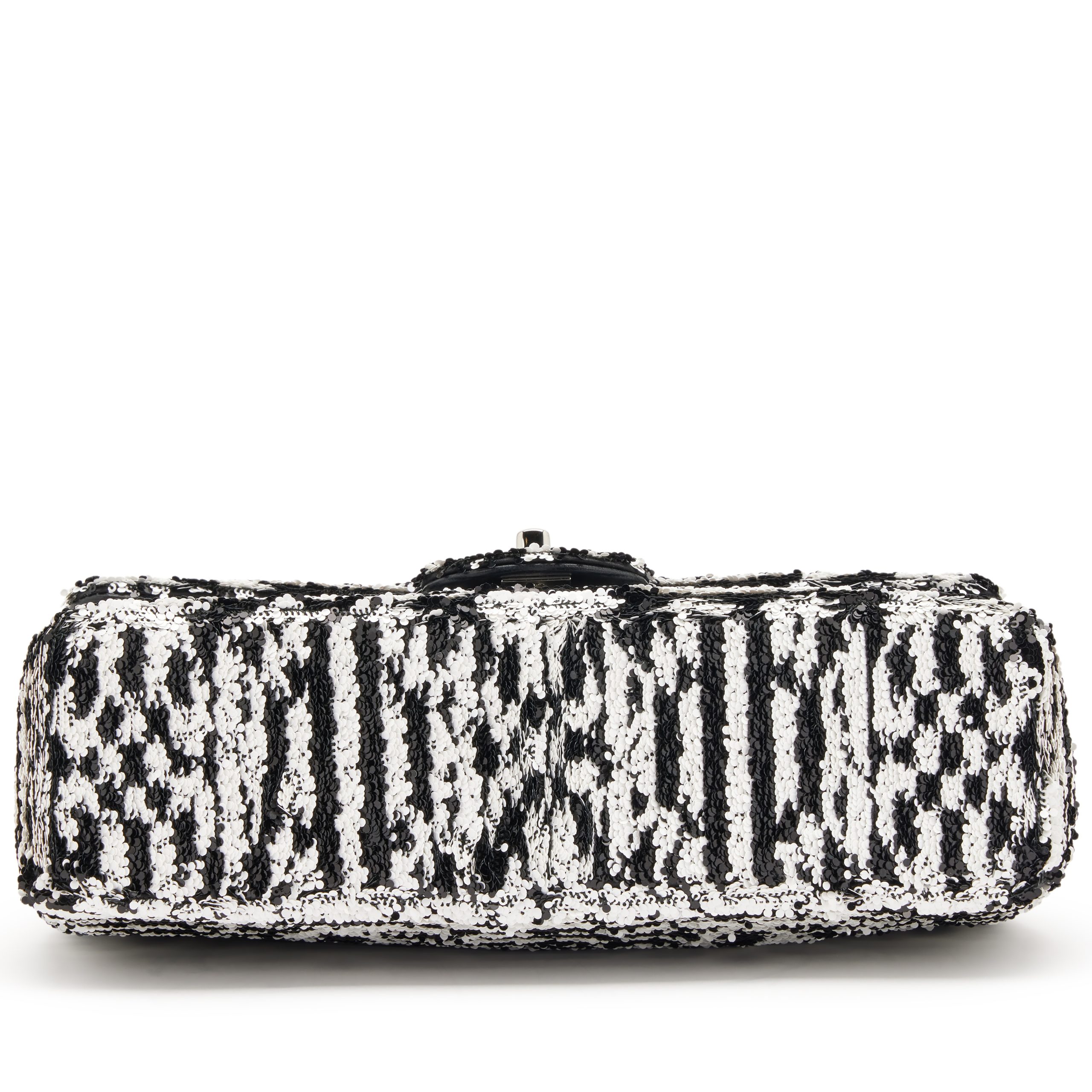 Chanel Black and White Sequin CC Logo and Black Lambskin Medium Single Flap Bag Silver Hardware, 2024The interior is lined in a black leatherIncludes camellia flower, ribbon, care booklet, felt protector, dust bag, and boxThis item is final sale