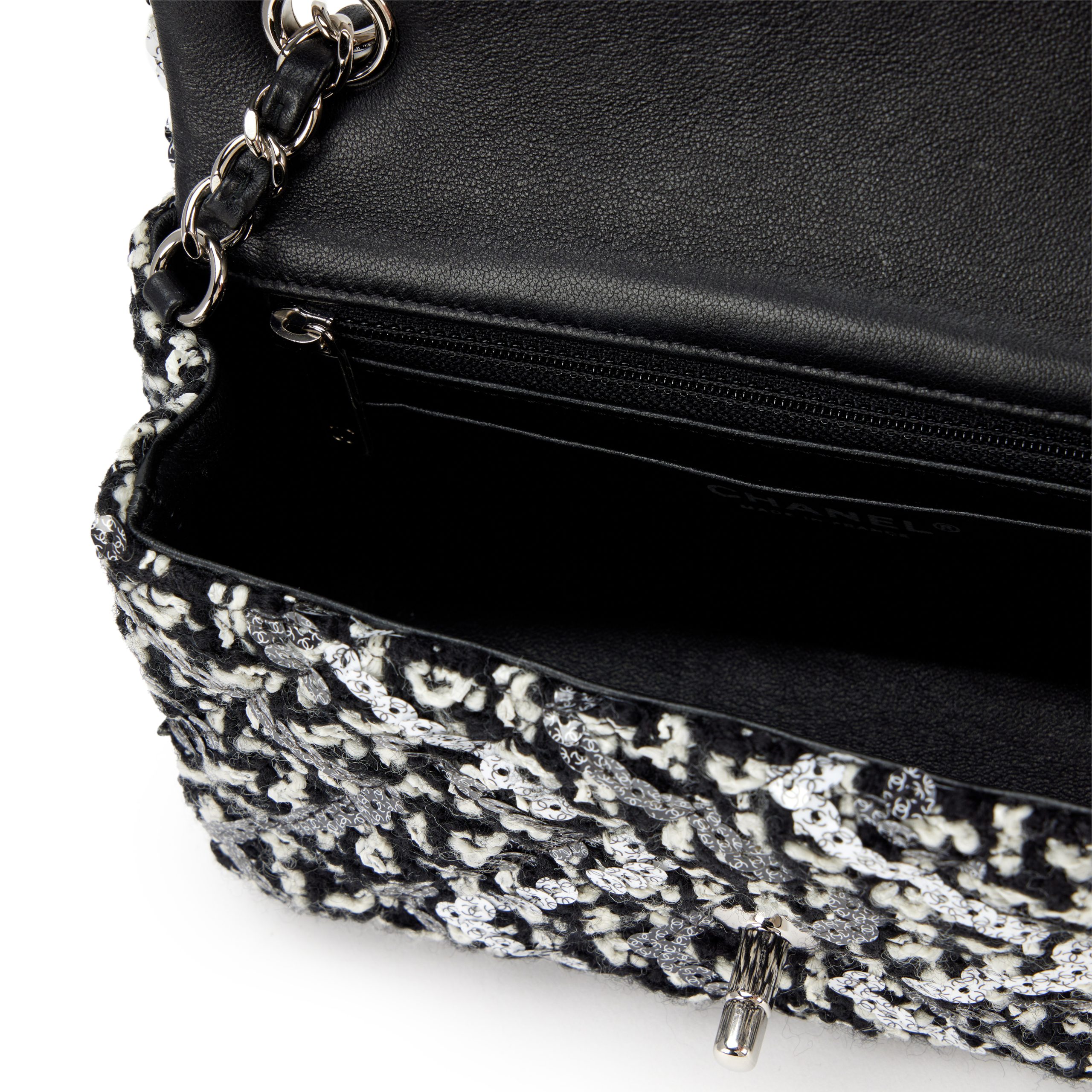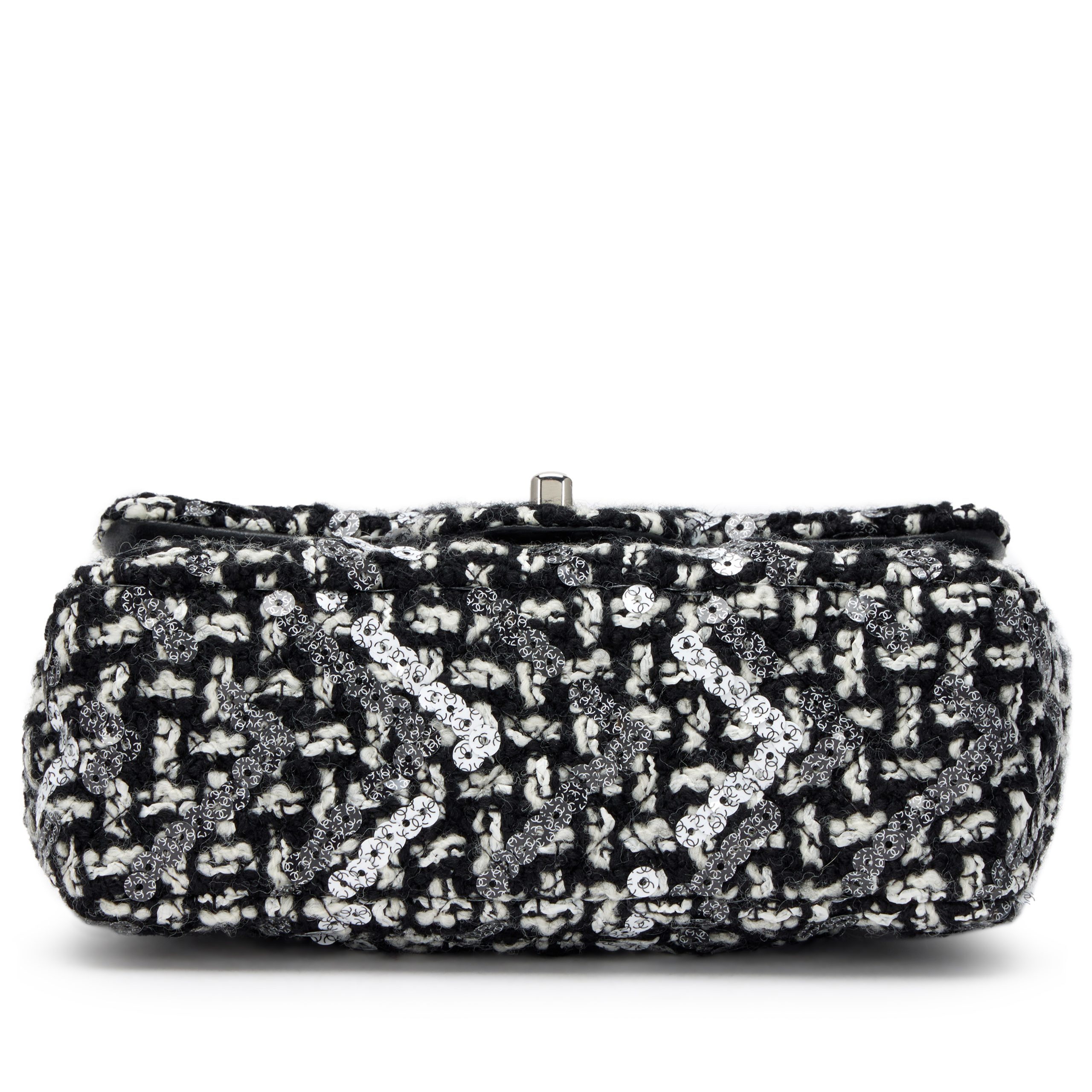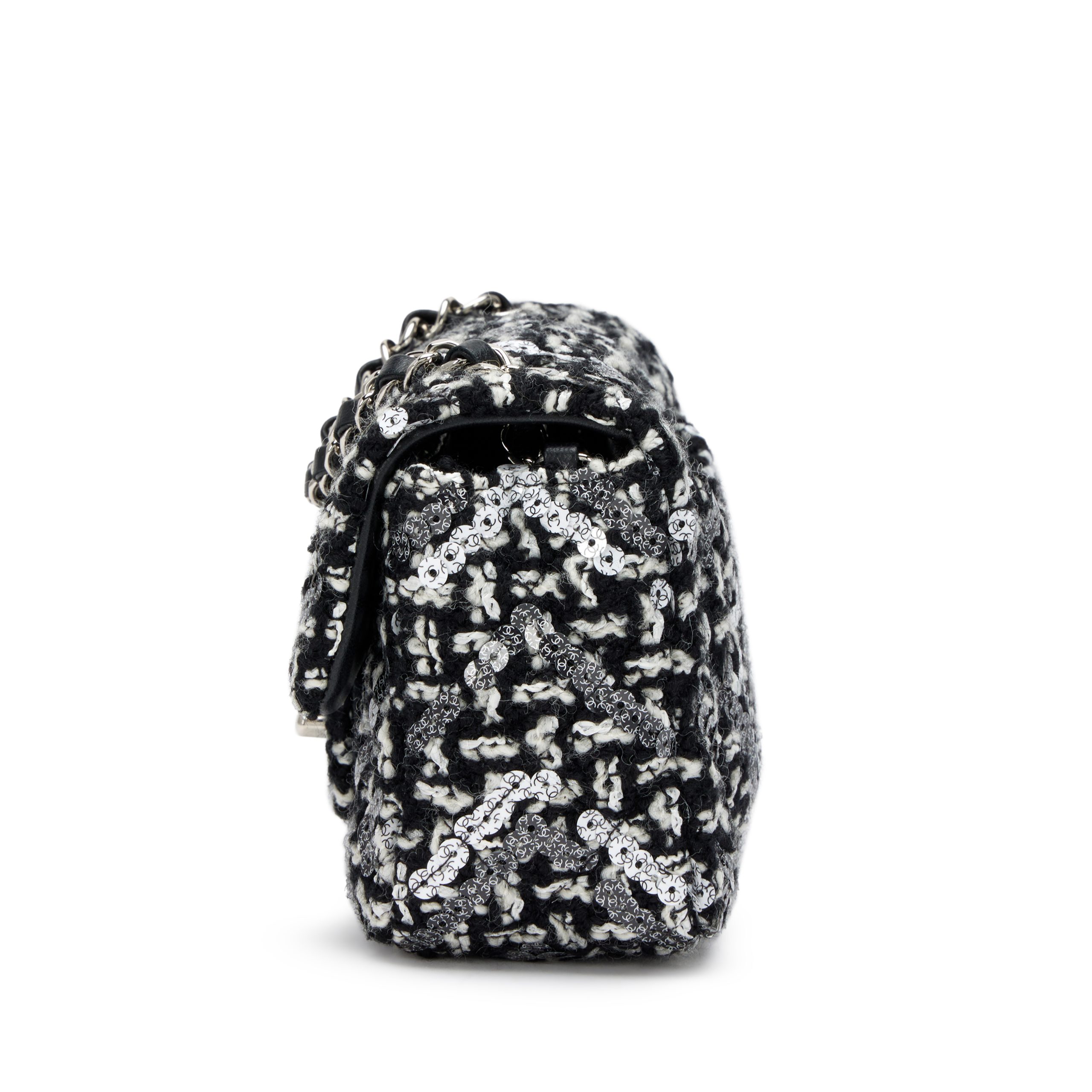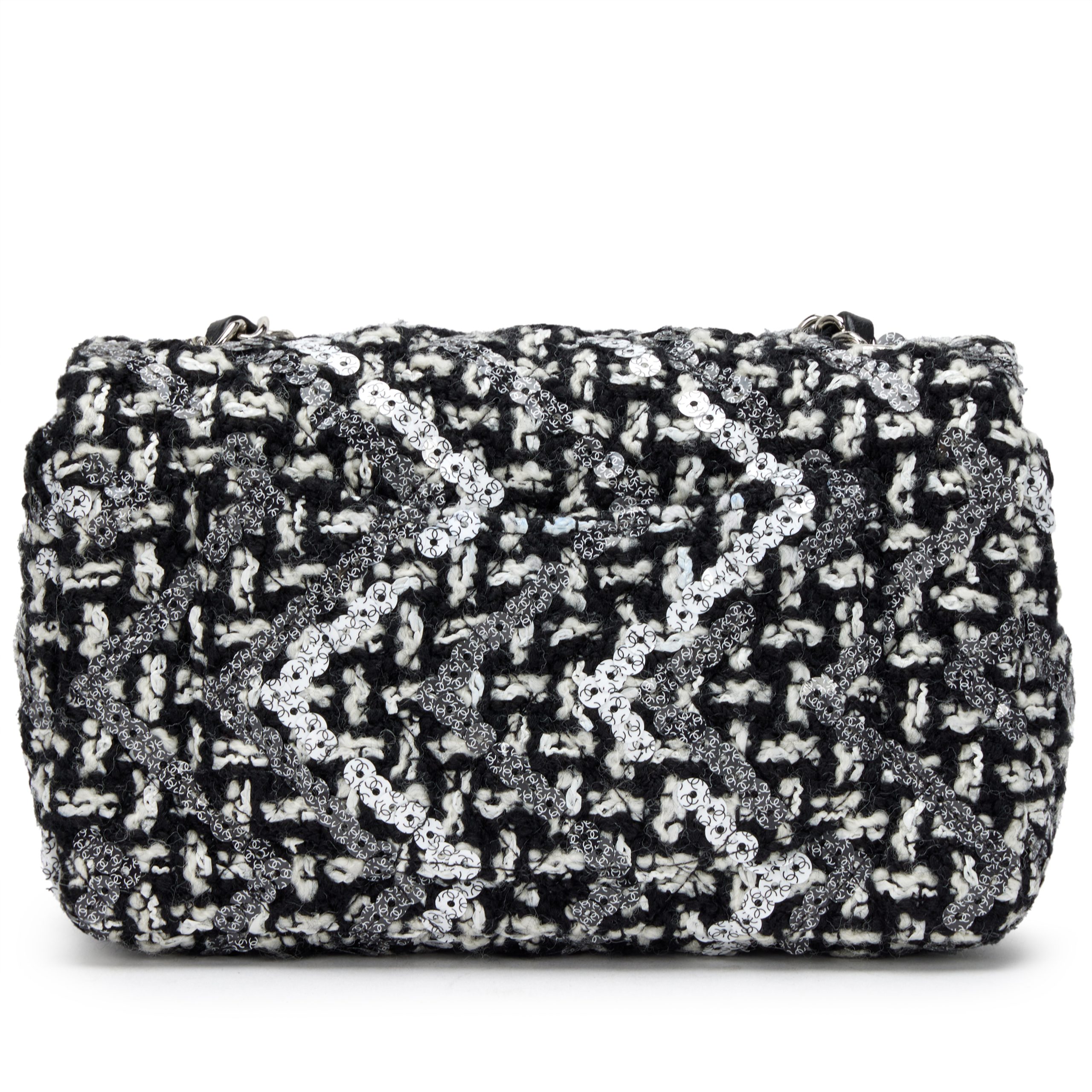 Chanel Black and White Tweed Sequin Mini Rectangular Classic Single Flap Bag Silver Hardware, 2021The interior is lined in a black leatherIncludes dust bagThis item is final sale and is not eligible for return
