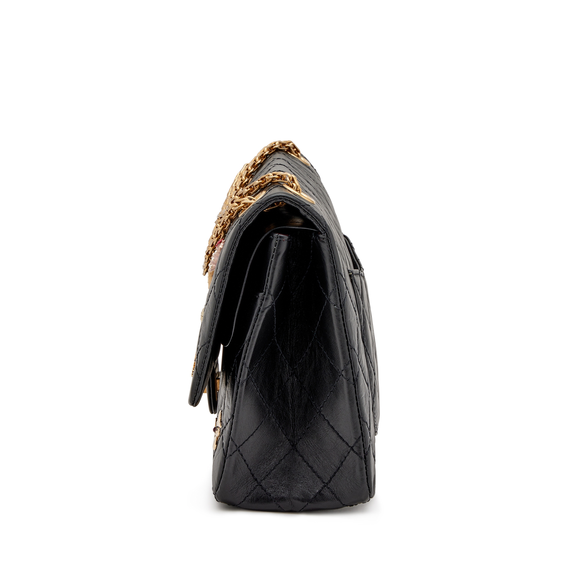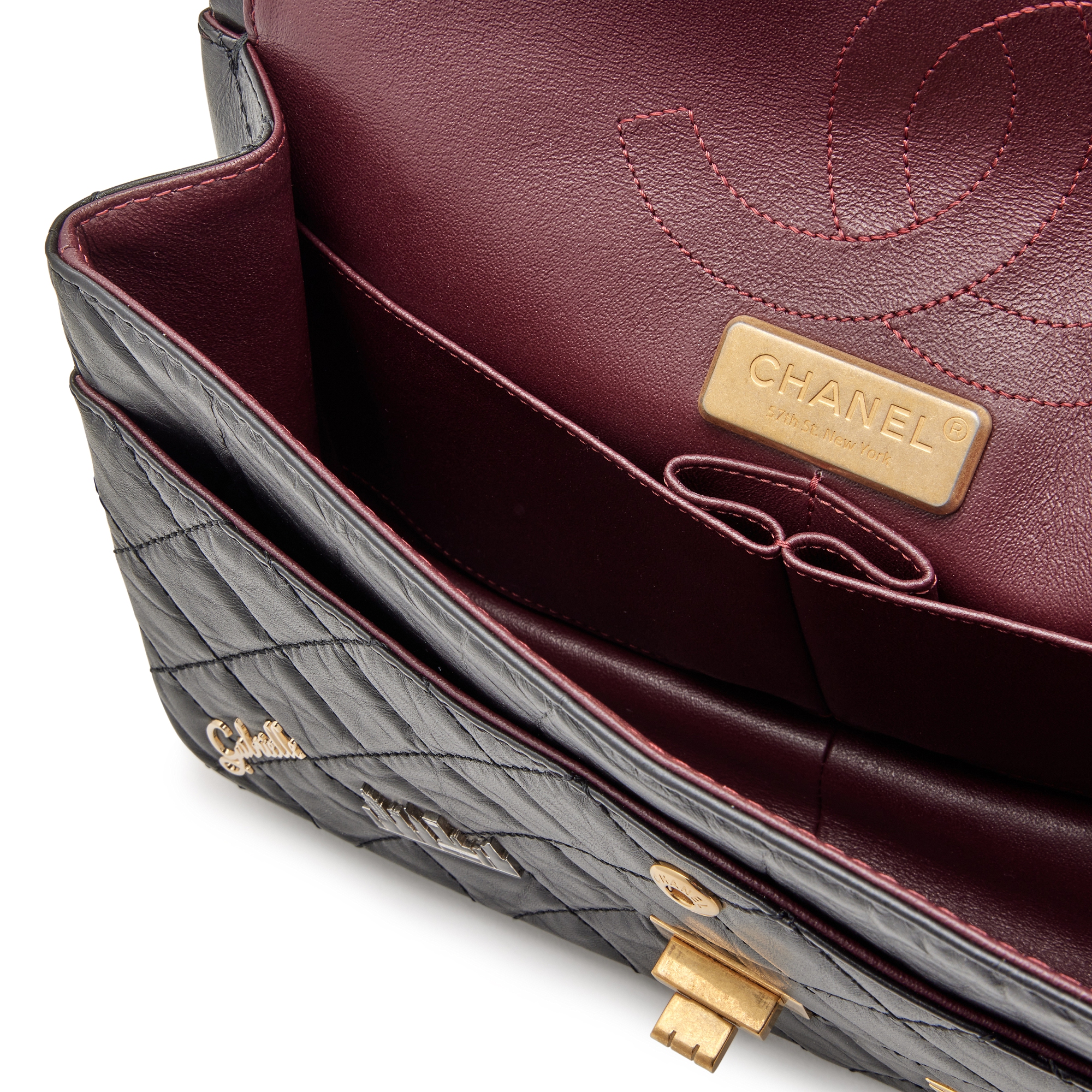 Chanel Black Quilted Aged Calfskin 57th Street Special Edition New York Lucky Charms 226 Reissue Double Flap Antique Gold Hardware, 2018The interior is lined in a burgundy leatherIncludes authenticity card, camellia flower, ribbon, care booklet, dust bag, and boxAntique Gold hardware finish is inherent to the designThis item is final sale