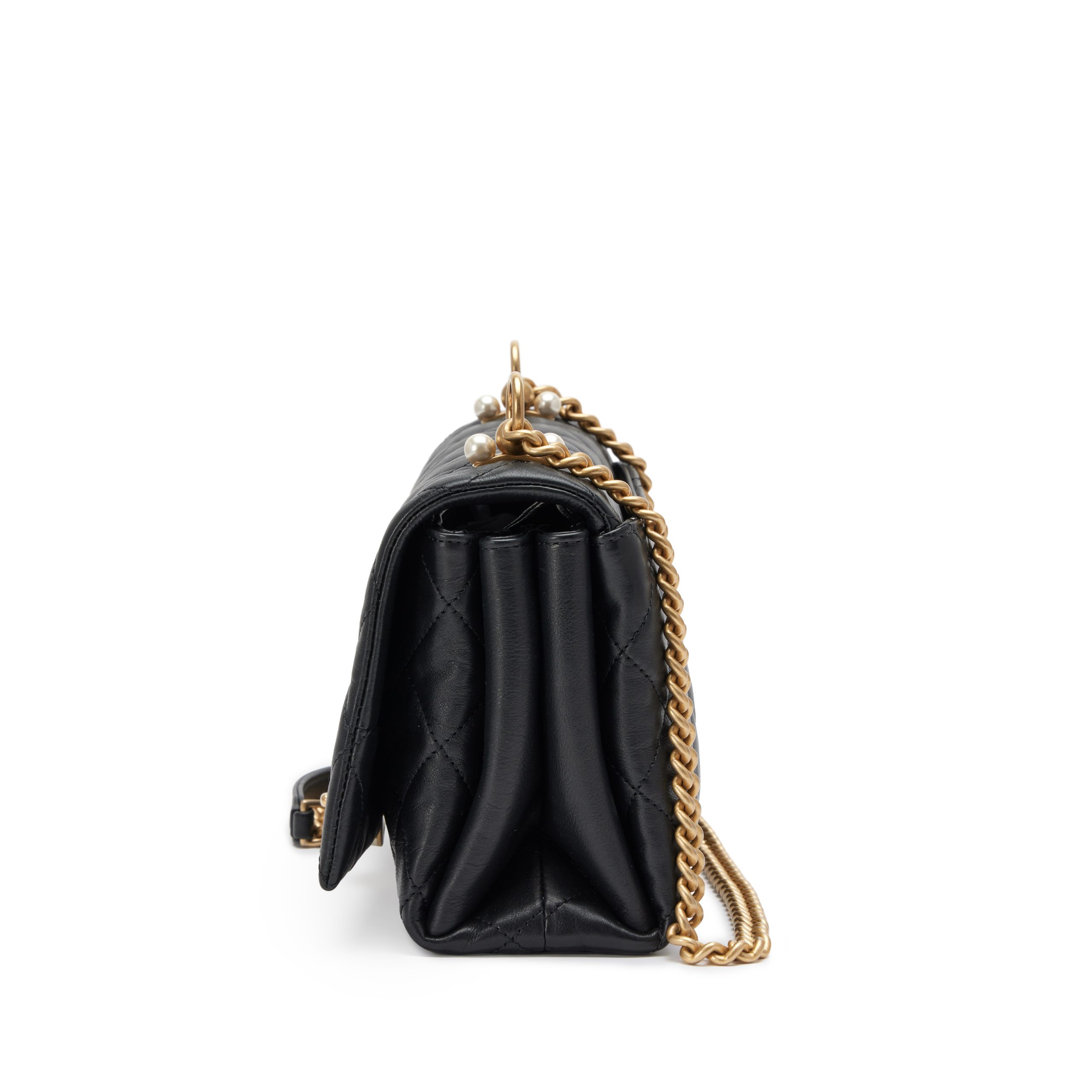 Chanel Black Quilted Calfskin Pearl Accordion Small Flap Bag Gold Hardware, 2019-2020The interior is lined with burgundy textile materialIncludes authenticity card, care booklet, dust bag, and boxThis item is final sale