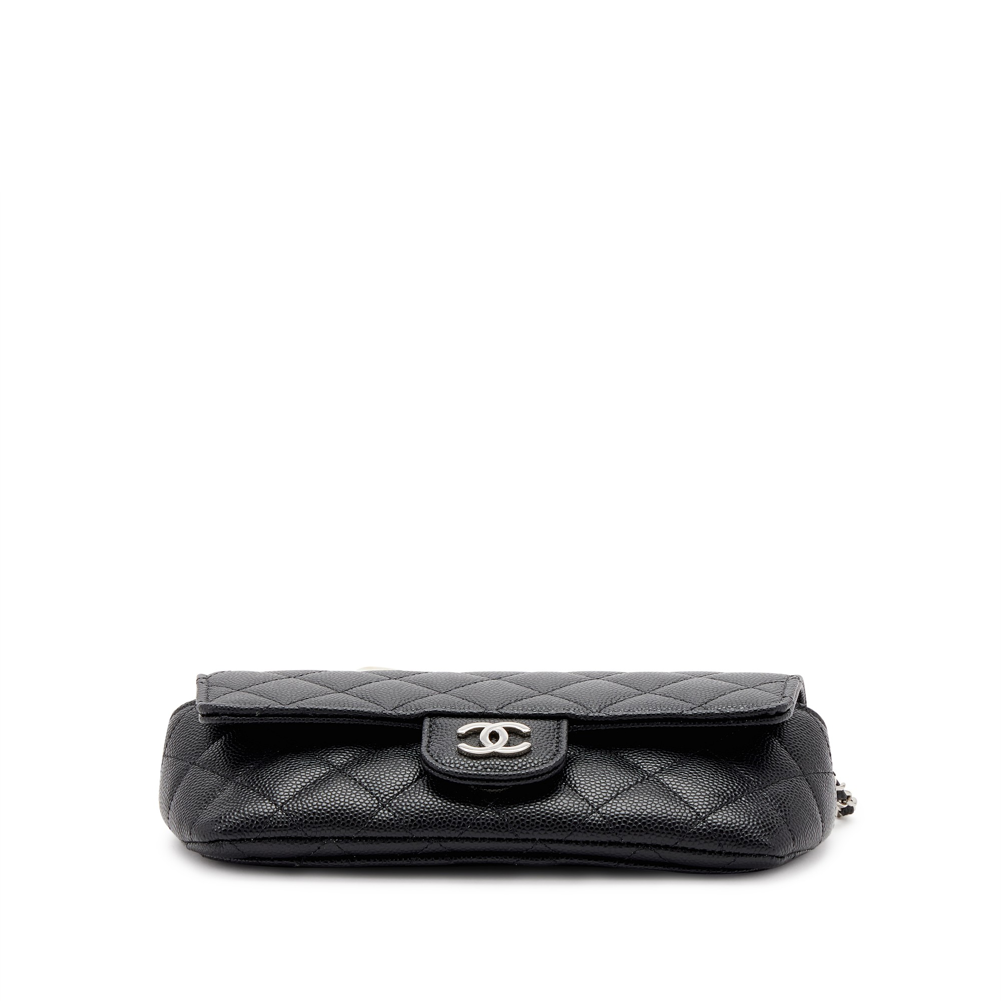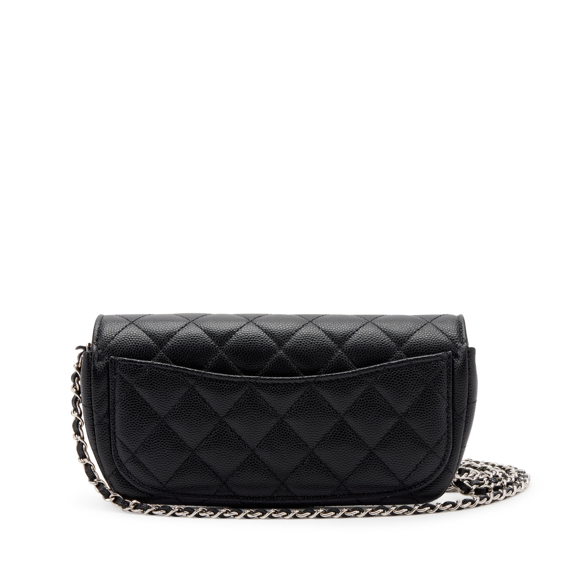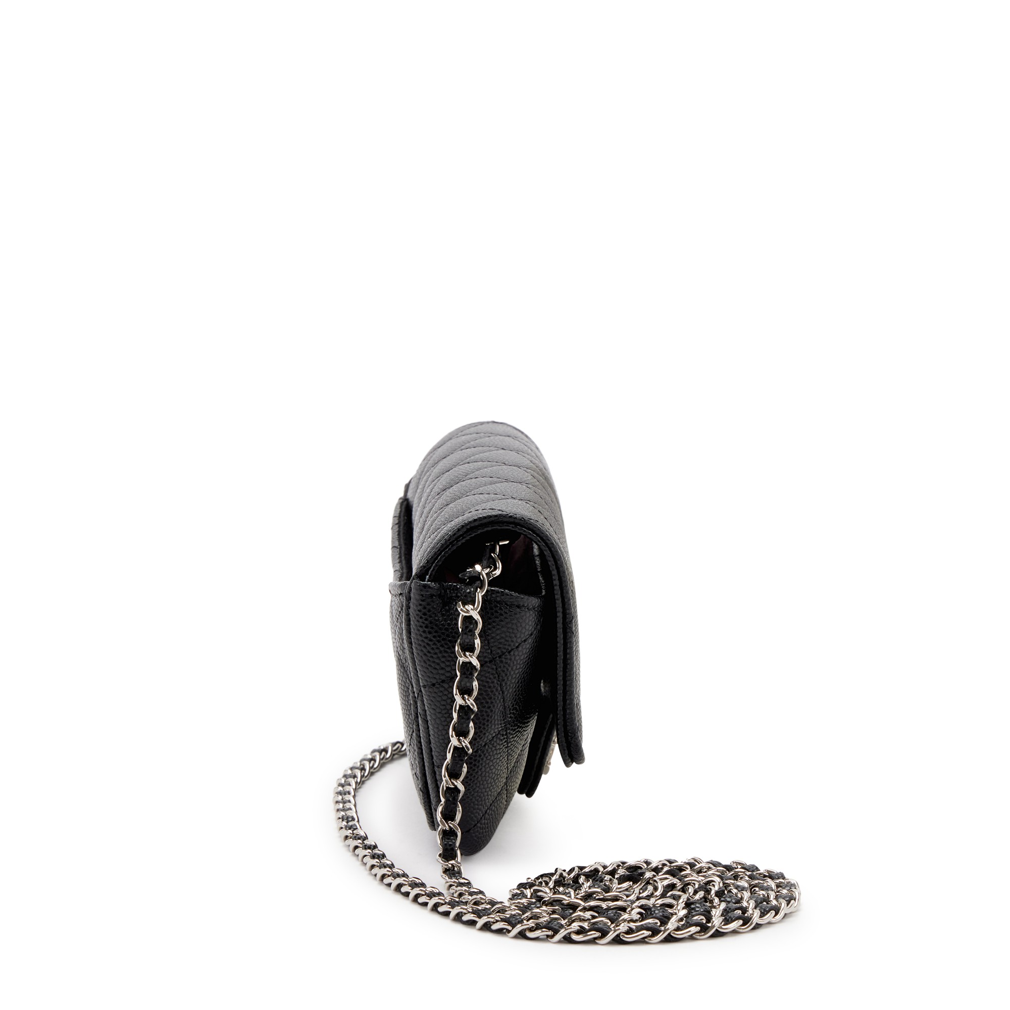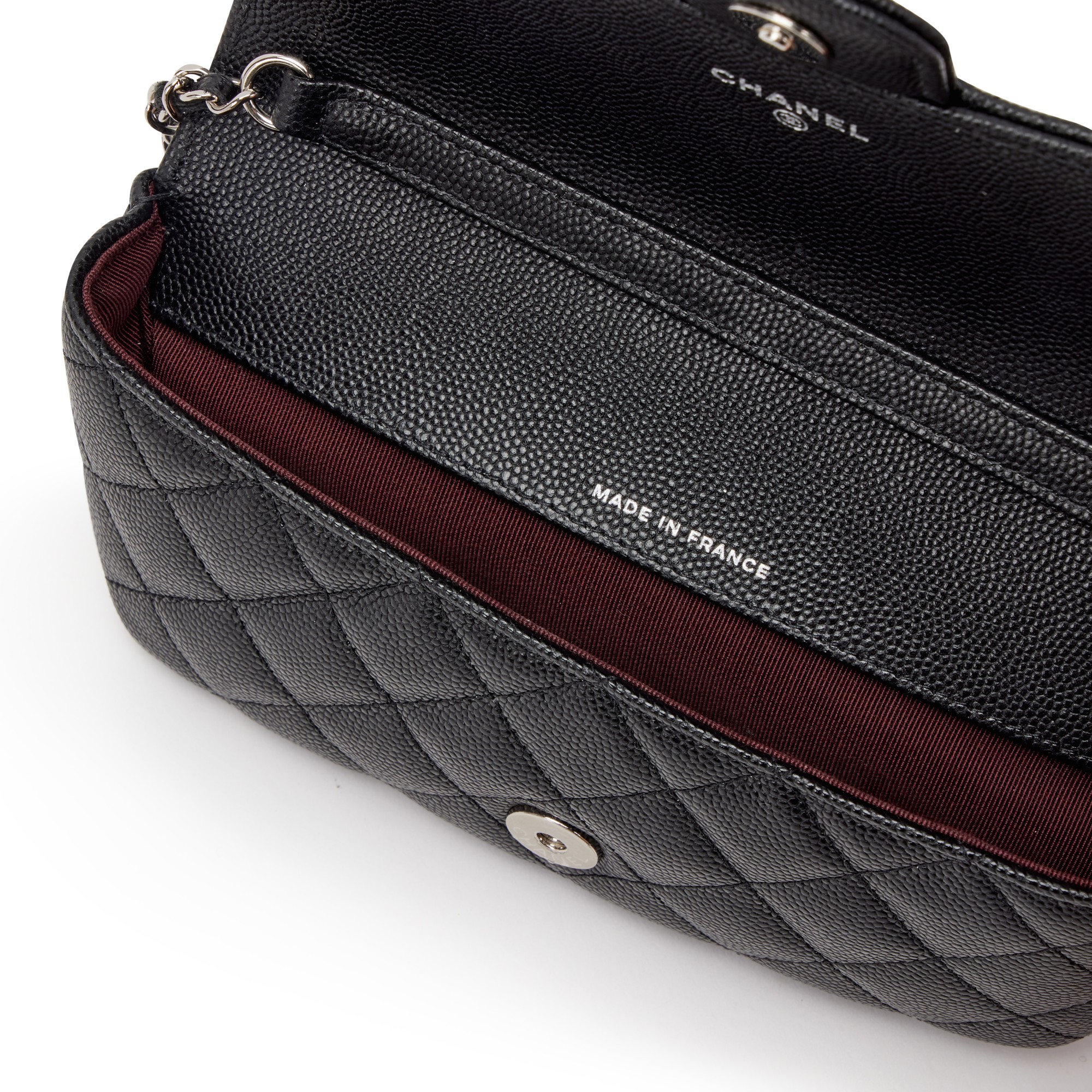 Chanel Black Quilted Caviar Glasses Case on Chain Silver Hardware, 2021This bag is lined with burgundy textile materialThis piece was featured during the 2021 Fall runway collectionIncludes tags, authenticity card, care booklet, dustbag and boxThis item is final sale