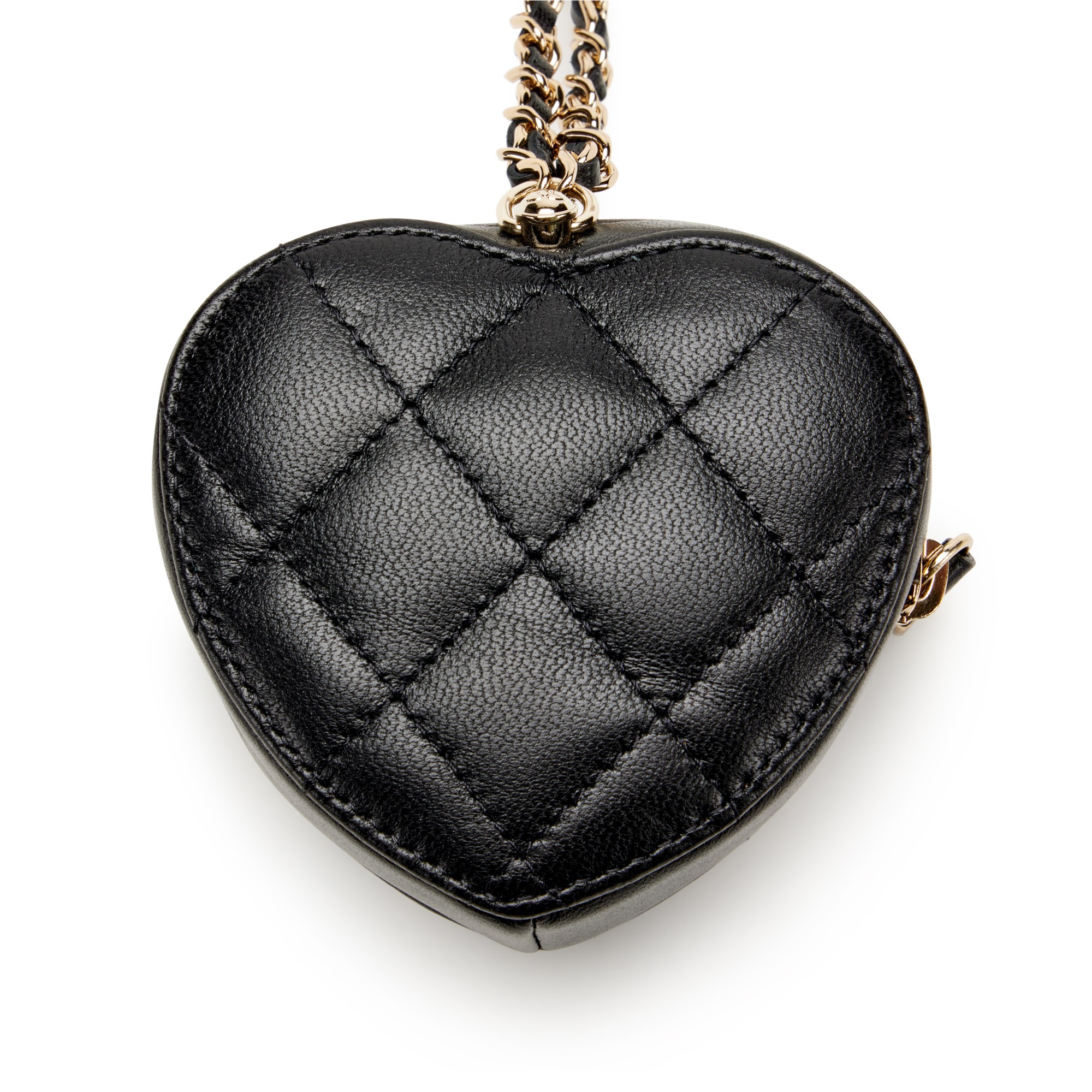 Black Quilted Lambskin Heart Zipped Coin Purse Necklace Gold Hardware, 2022