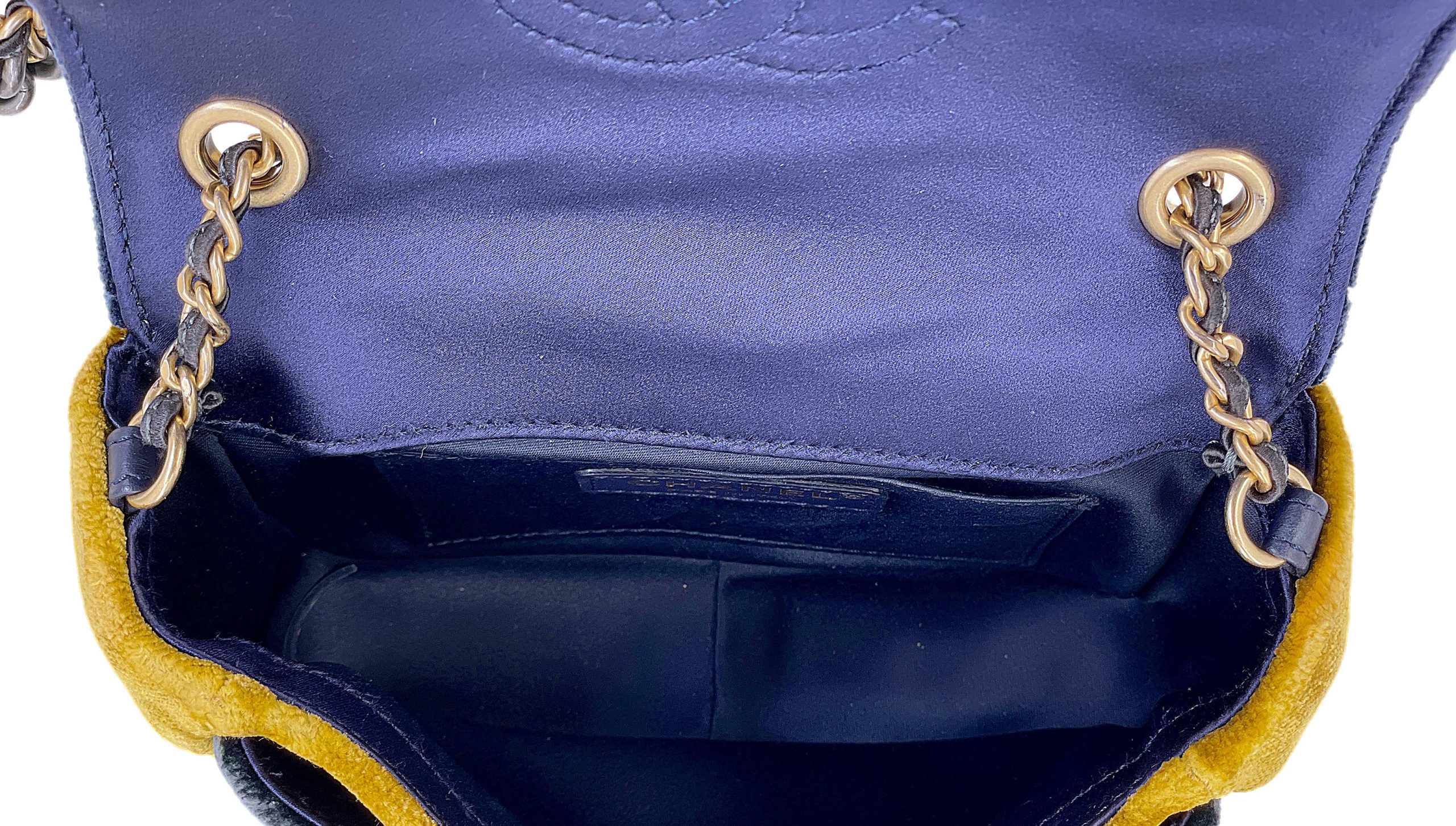 Chanel Blue, Gray, and Dark Gold Velvet Paris-Cosmopolite Mtiers d’Art Mini Flap Bag Aged Gold and Silver Hardware, 2018The interior is lined in a blue satinIncludes Dark Gold Velvet Card Case with Pearl ButtonThis item is final sale