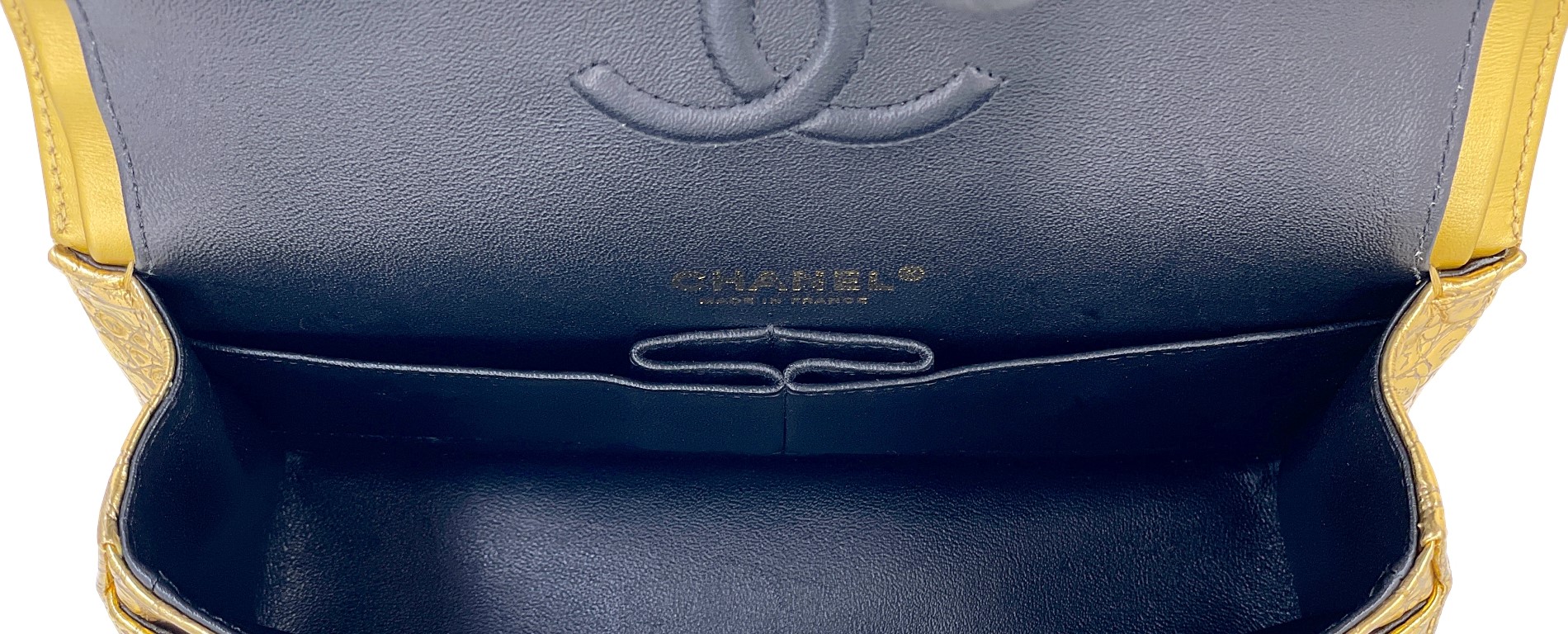Chanel Gold Crocodile Embossed Calfskin Egyptian Small Classic Double Flap Bag Gold Hardware, 2019The interior is lined in a navy blue leatherIncludes authenticity card and care bookletThis item is final sale