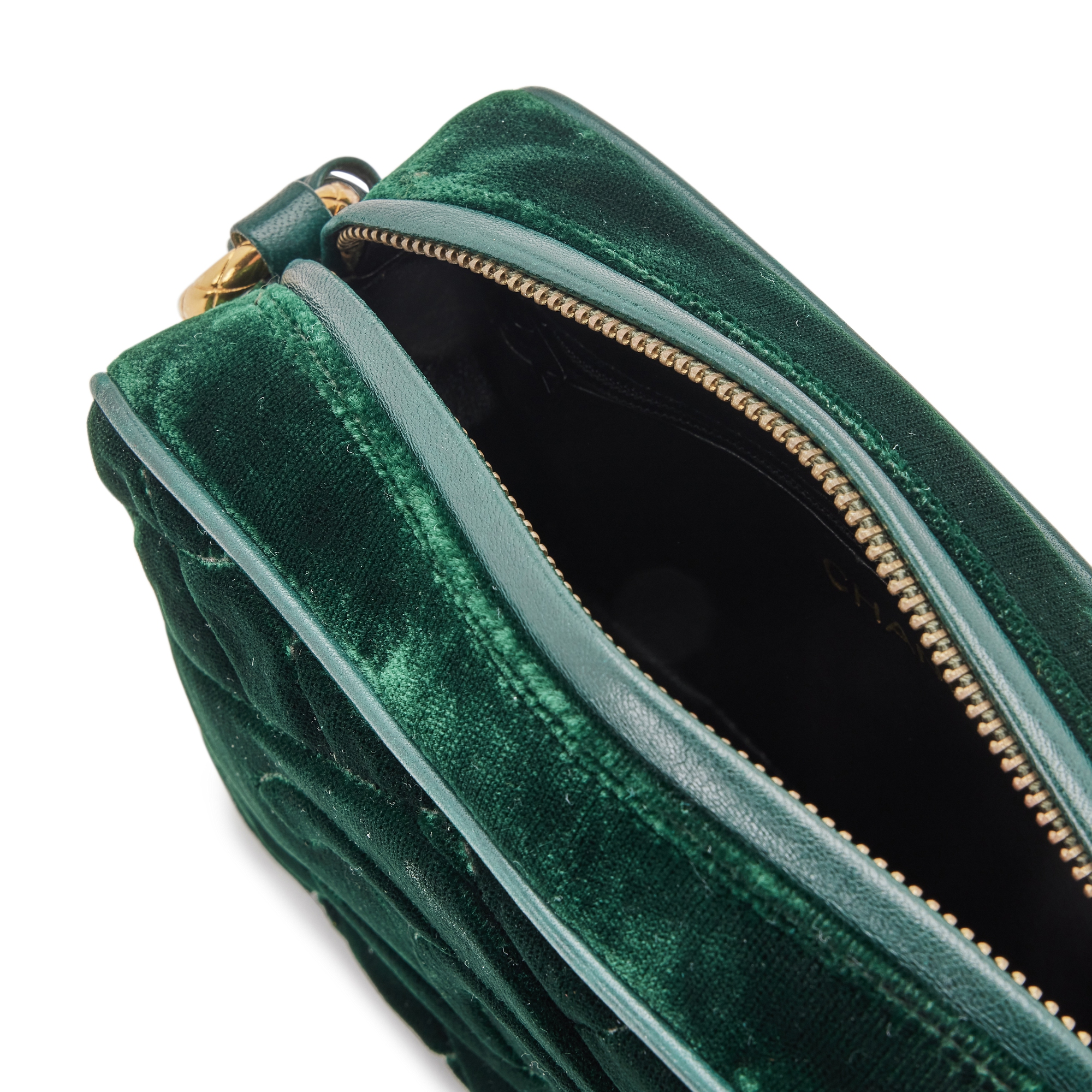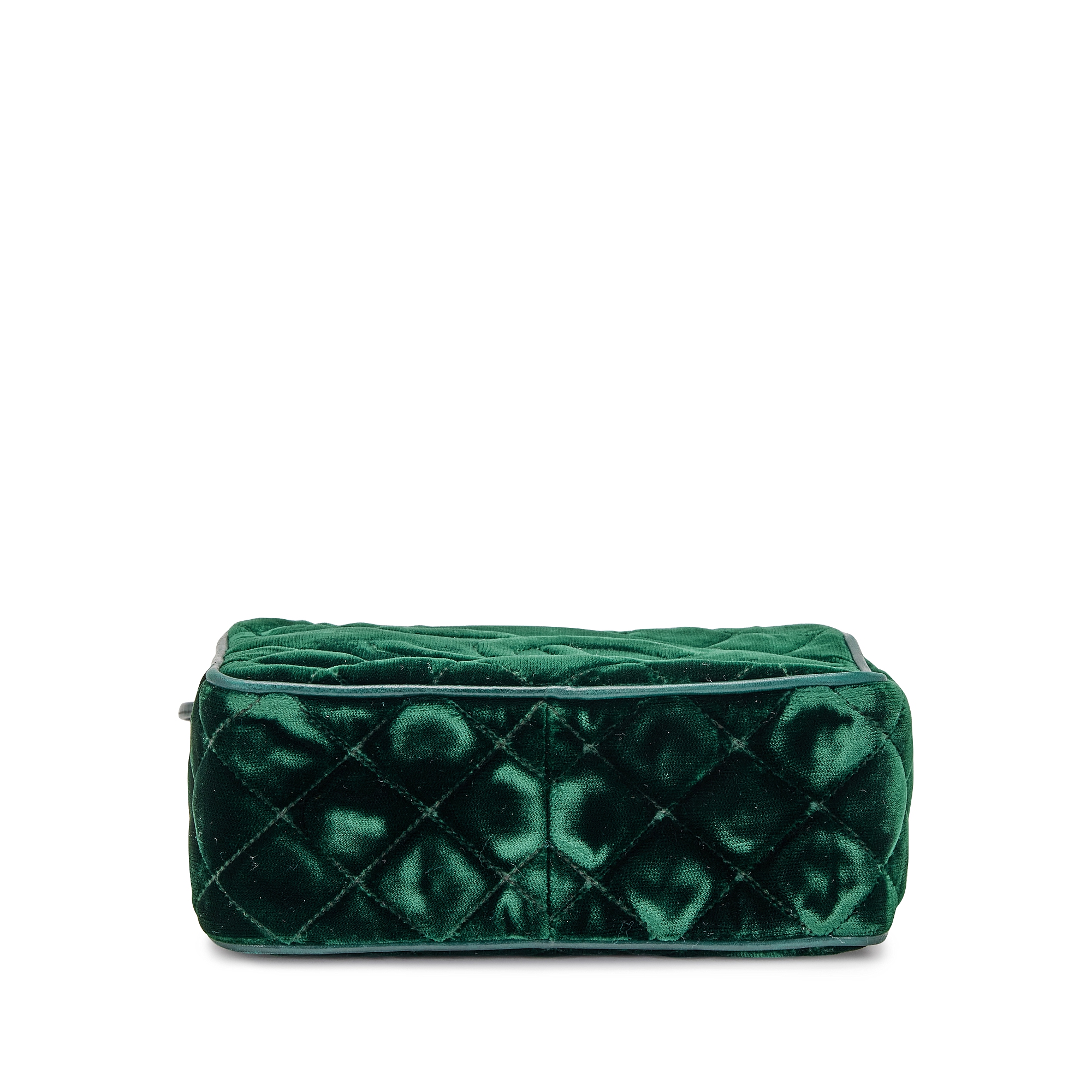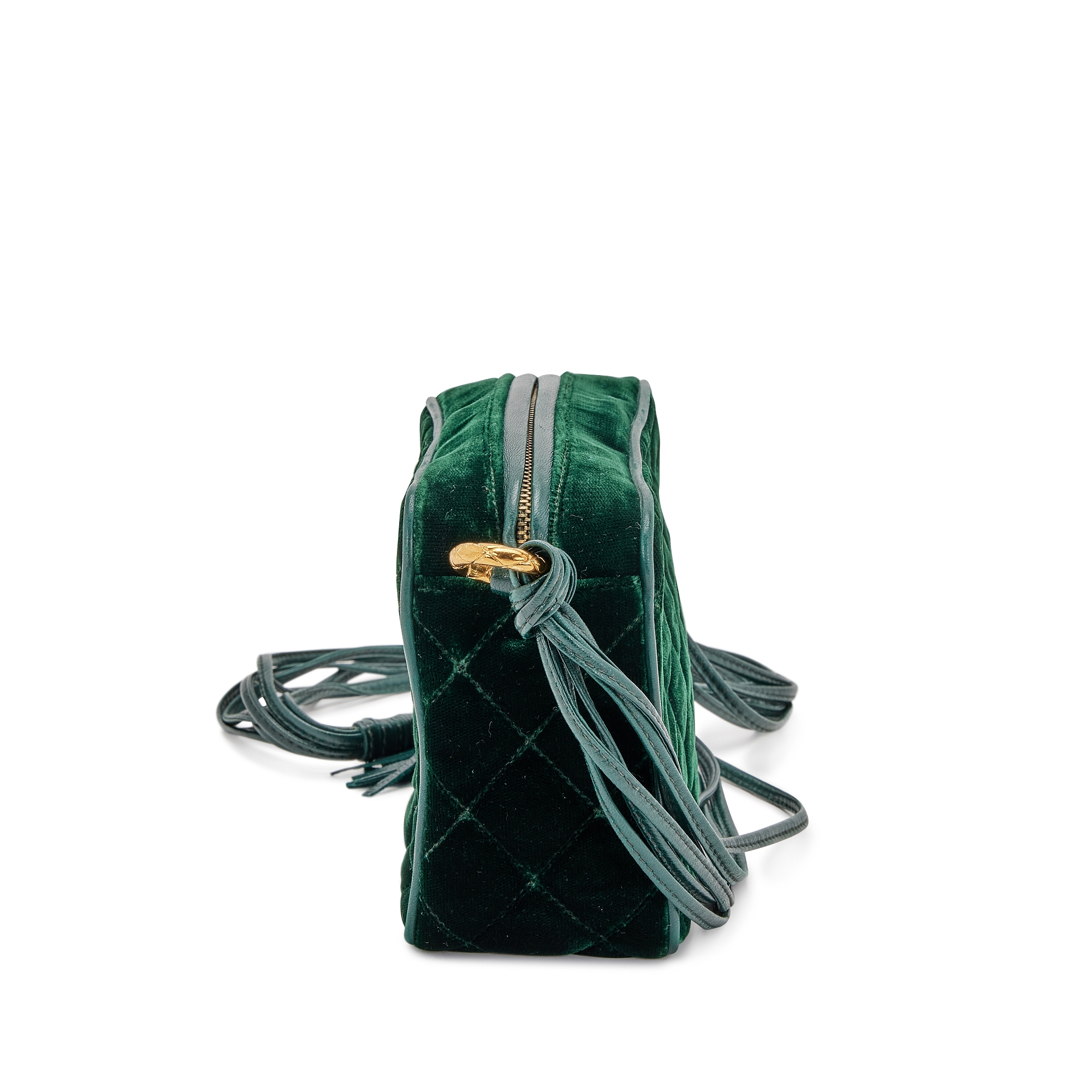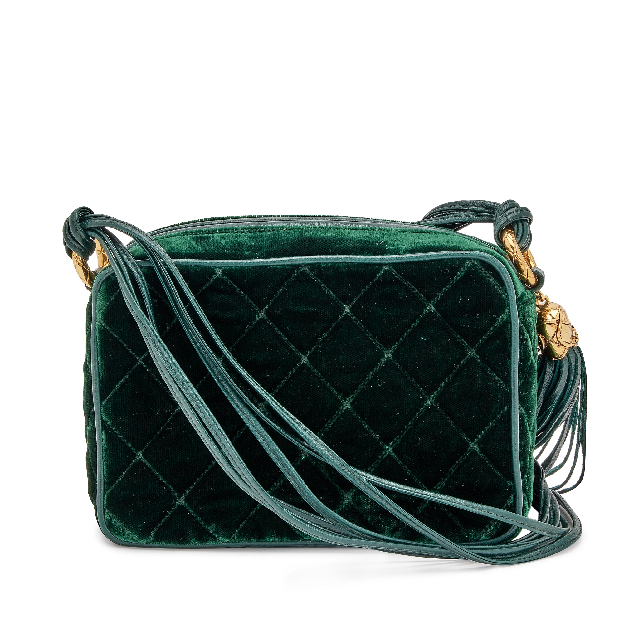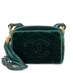 Chanel Green Quilted Velvet CC Camera Tassel Bag Gold Hardware, 1991The interior is lined in a black leatherIncludes authenticity card and dust bag This item is final sale