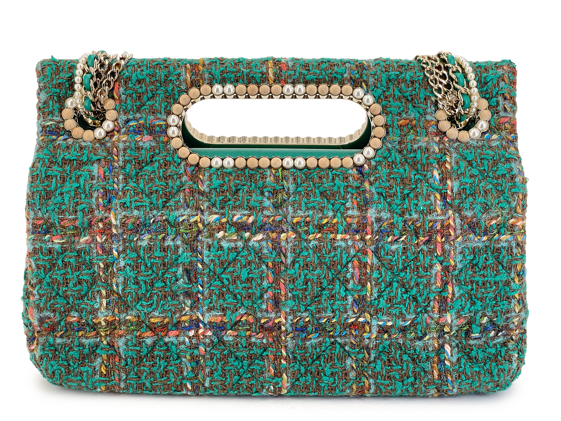 Green Tweed Pearl Paris-Dakar Wooden Flap Bag Gold Hardware, 2023
