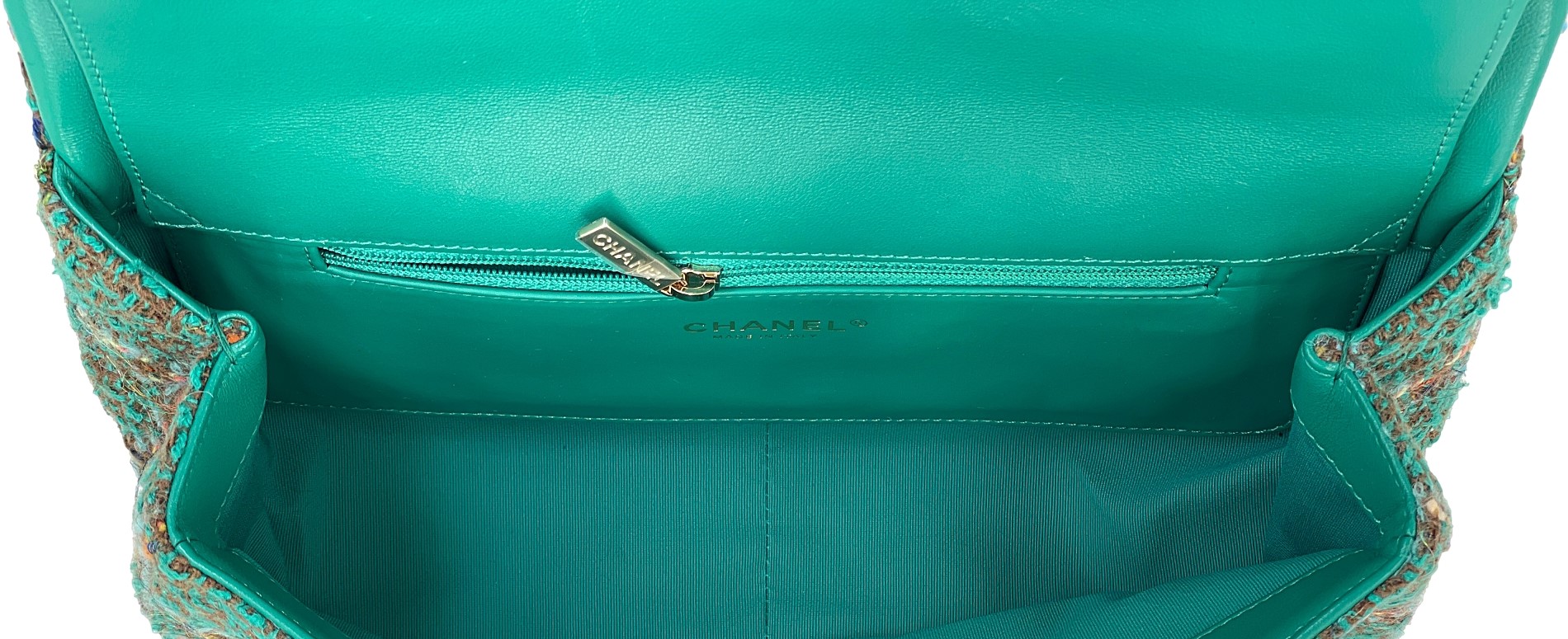 Chanel Green Tweed Pearl Paris-Dakar Wooden Flap Bag Gold Hardware, 2023The interior is lined in a tonal textile materialIncludes tag, dust bag, and boxThis item is final sale