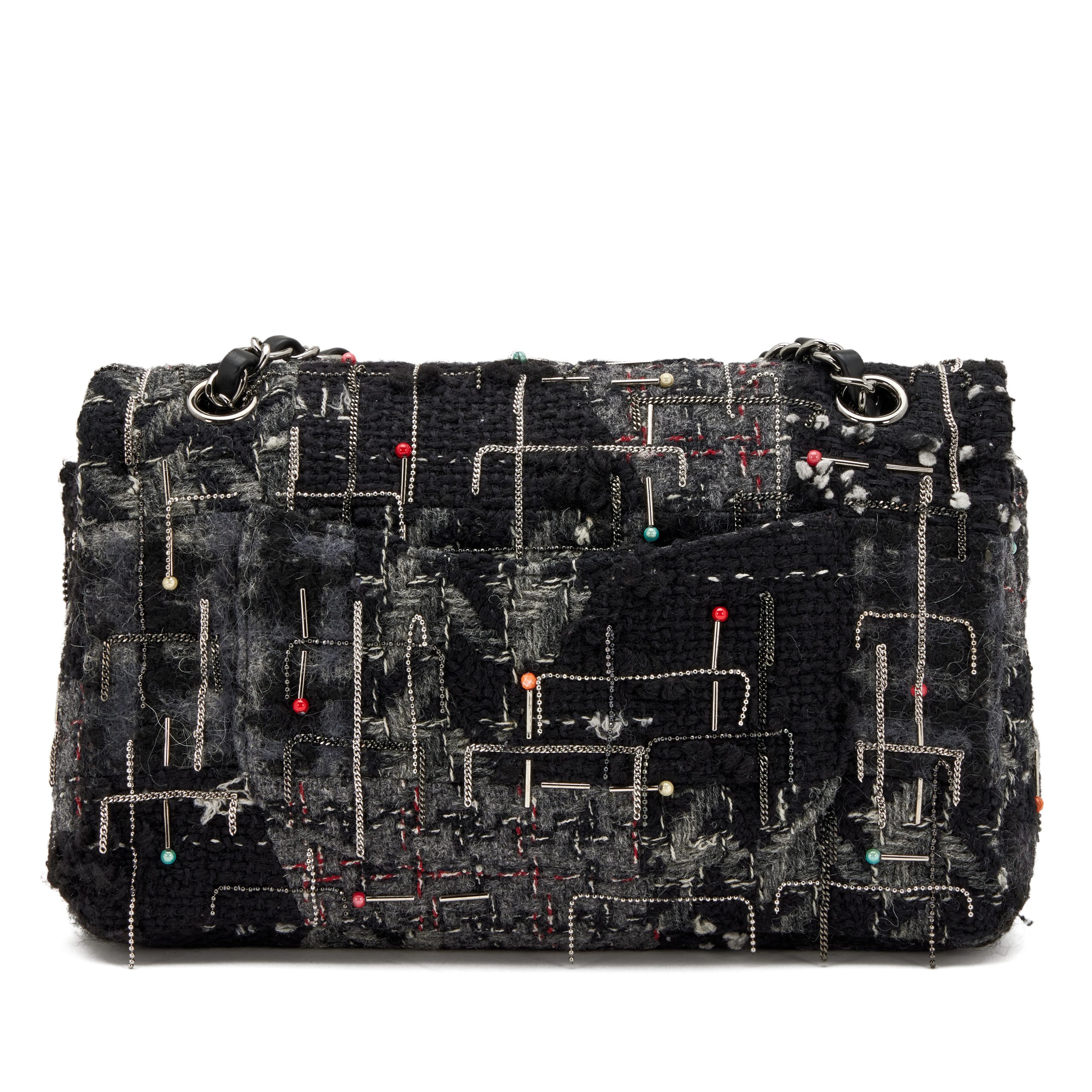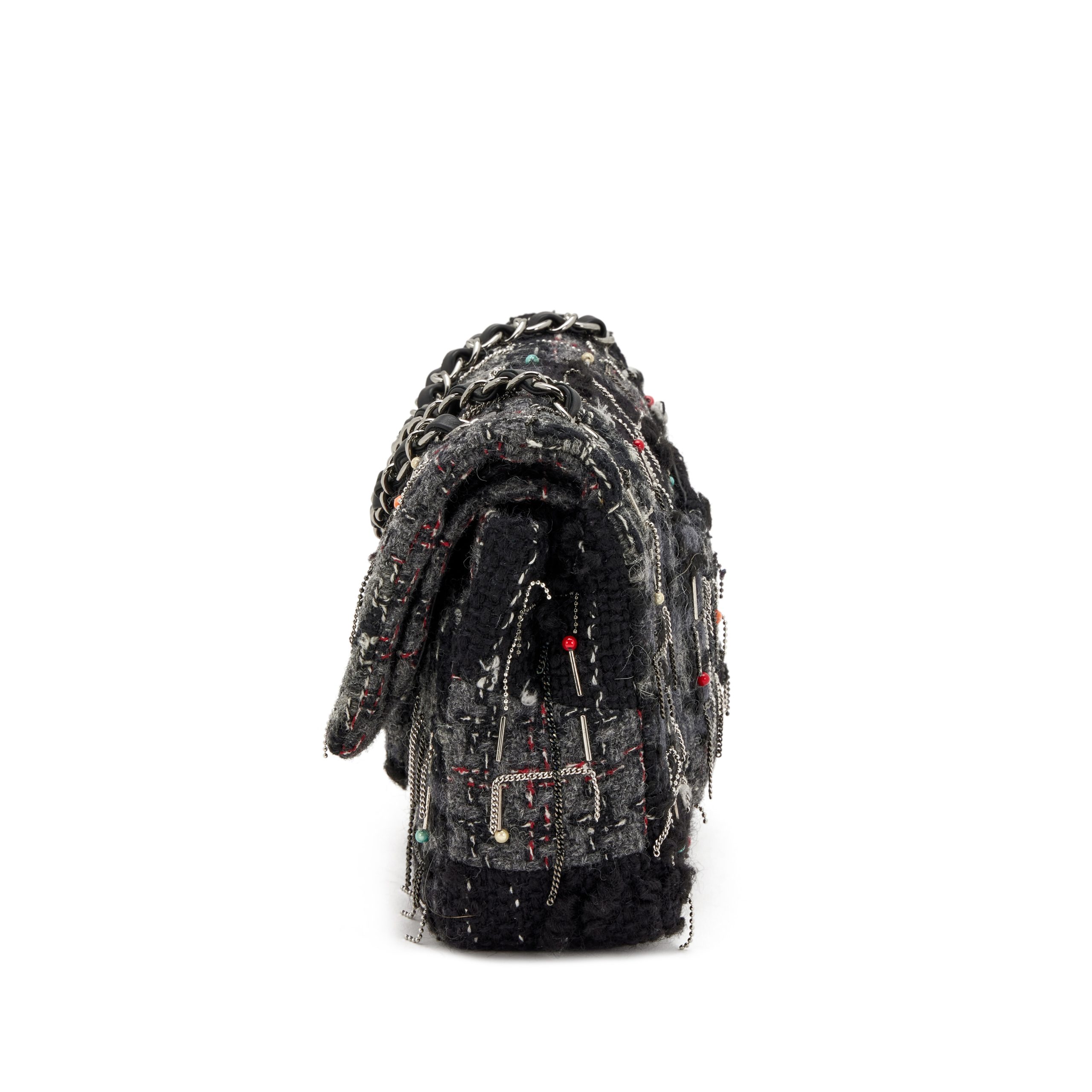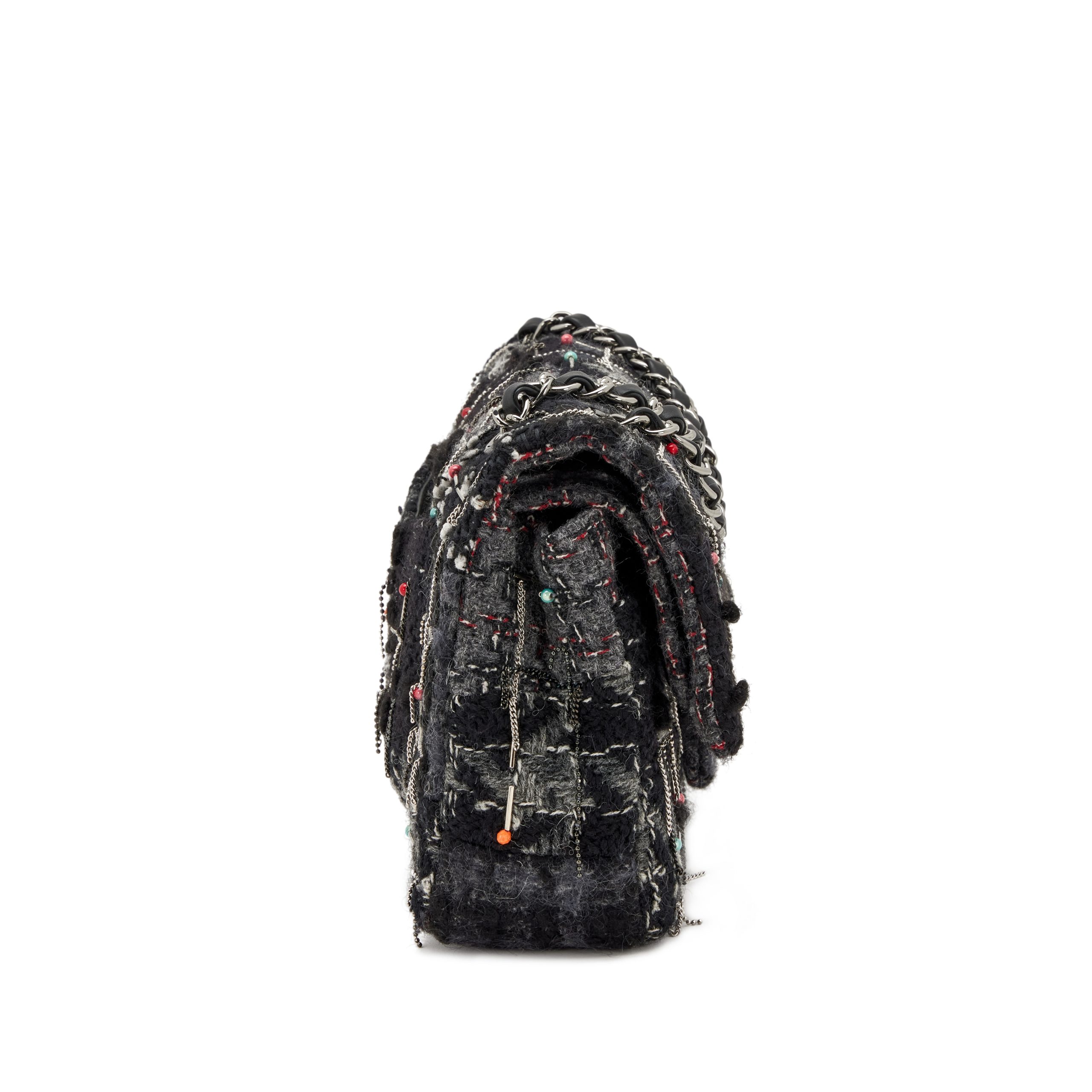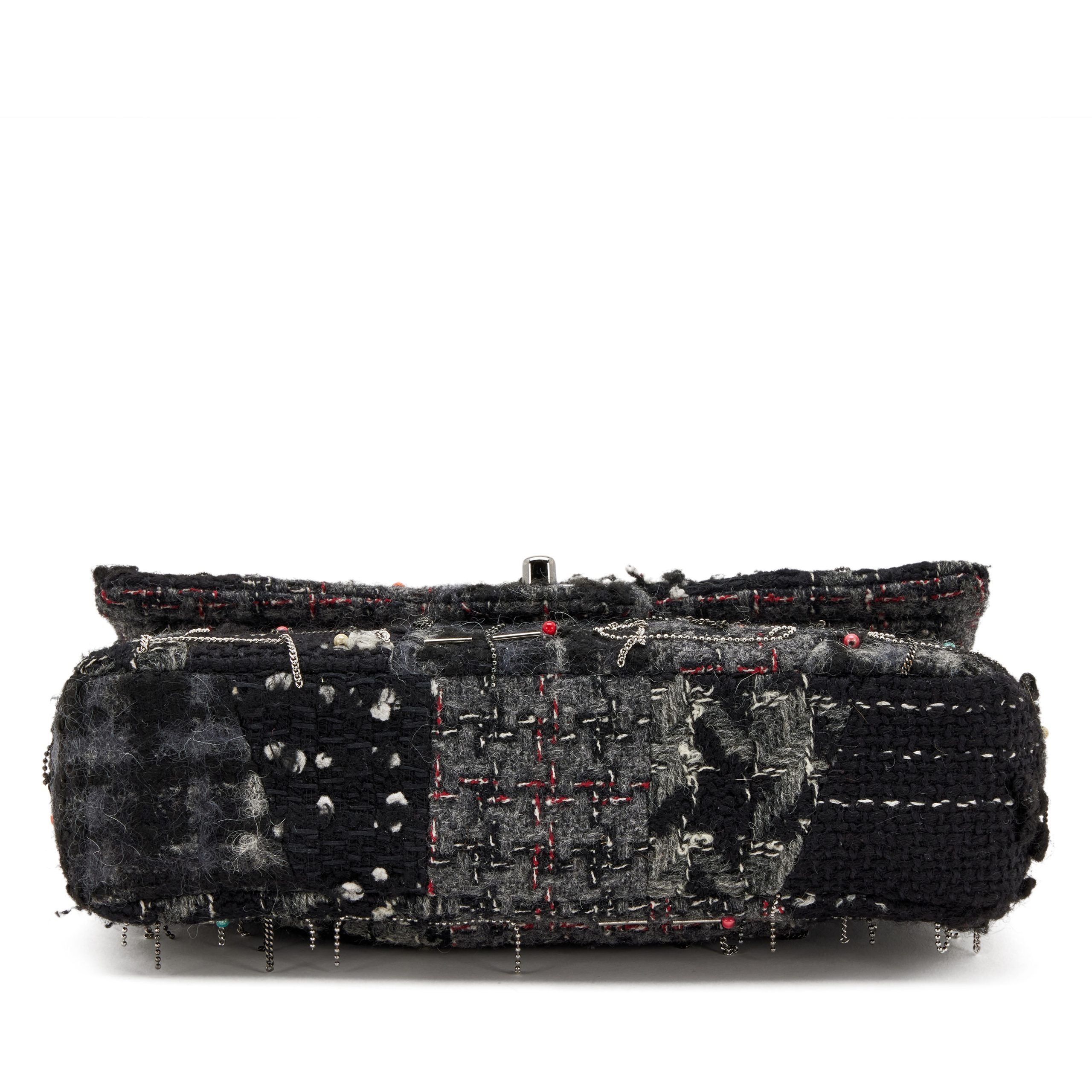 Chanel Grey, Black, and Red Embellished Chains and Beads Wool Tweed Medium Classic Double Flap Ruthenium Hardware, 2016The interior is lined in a black leatherIncludes care booklet, camellia flower, ribbon, dust bag, and boxThis item is final sale