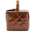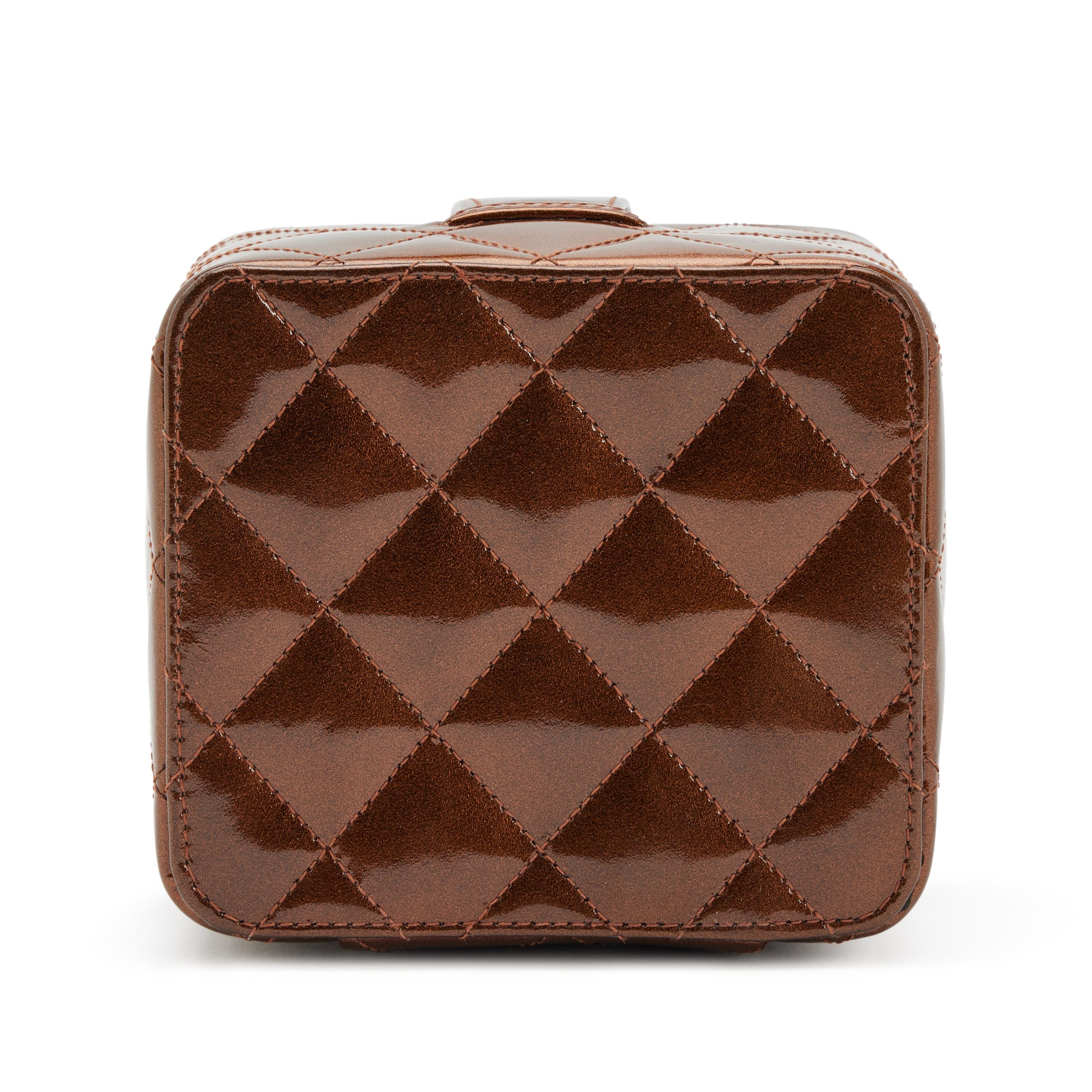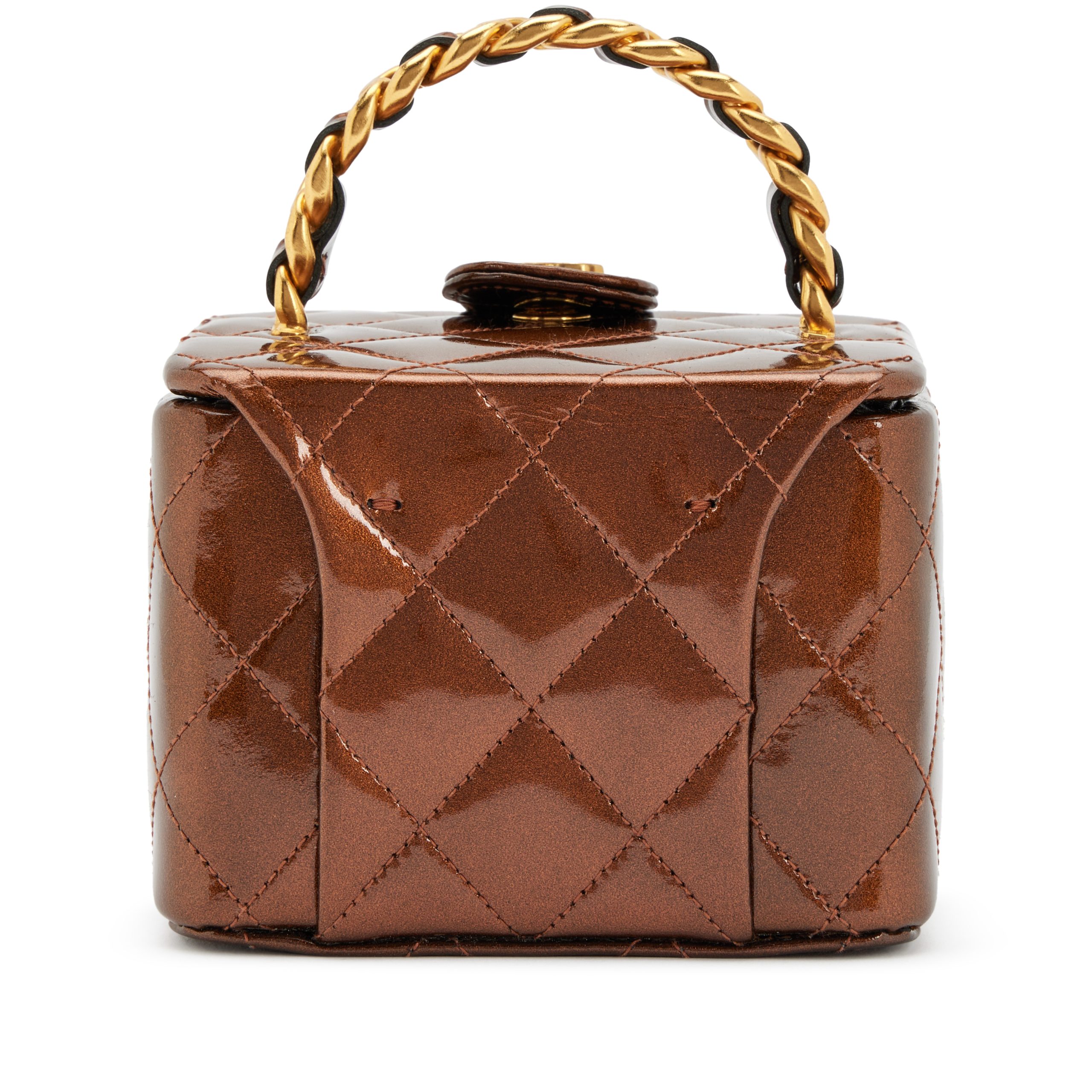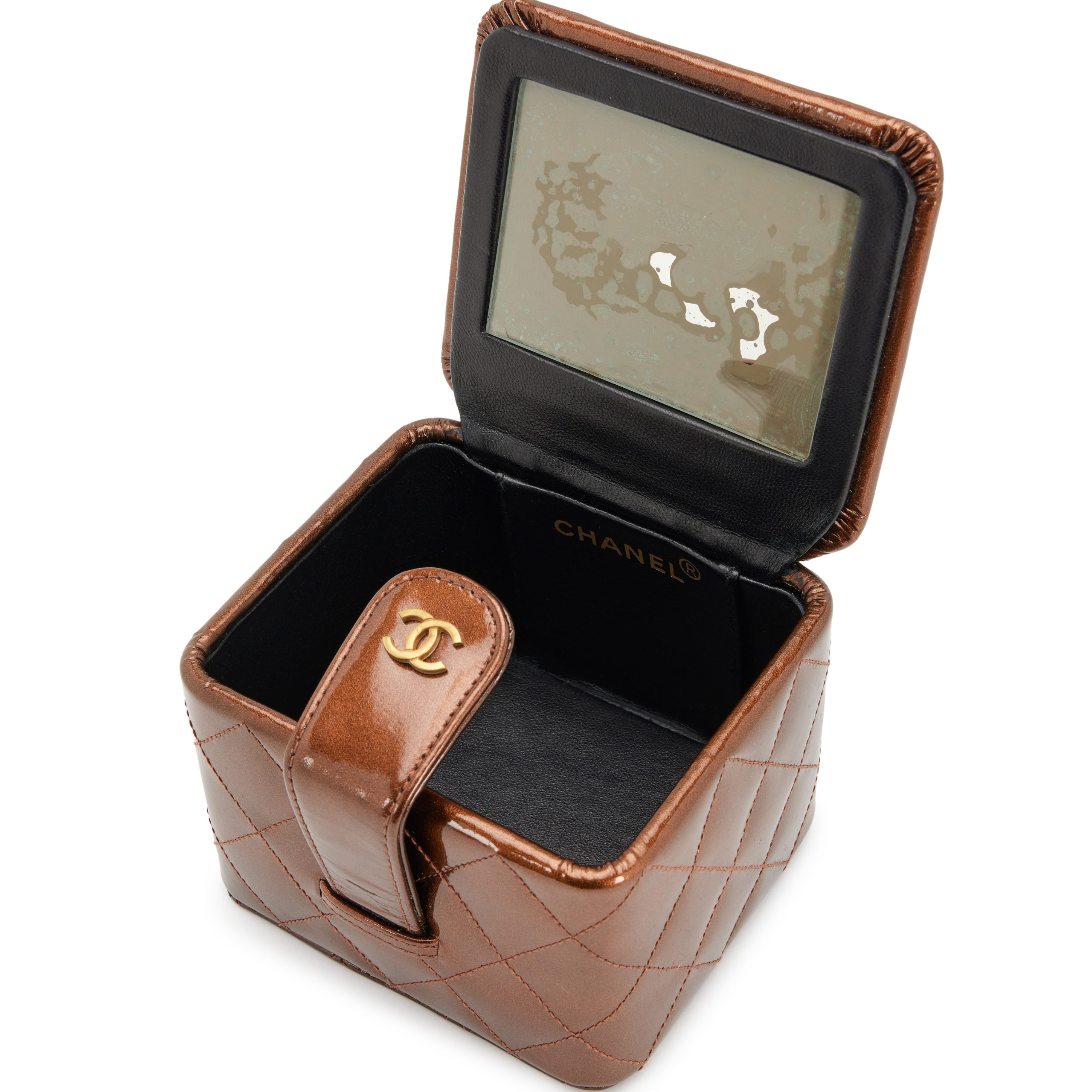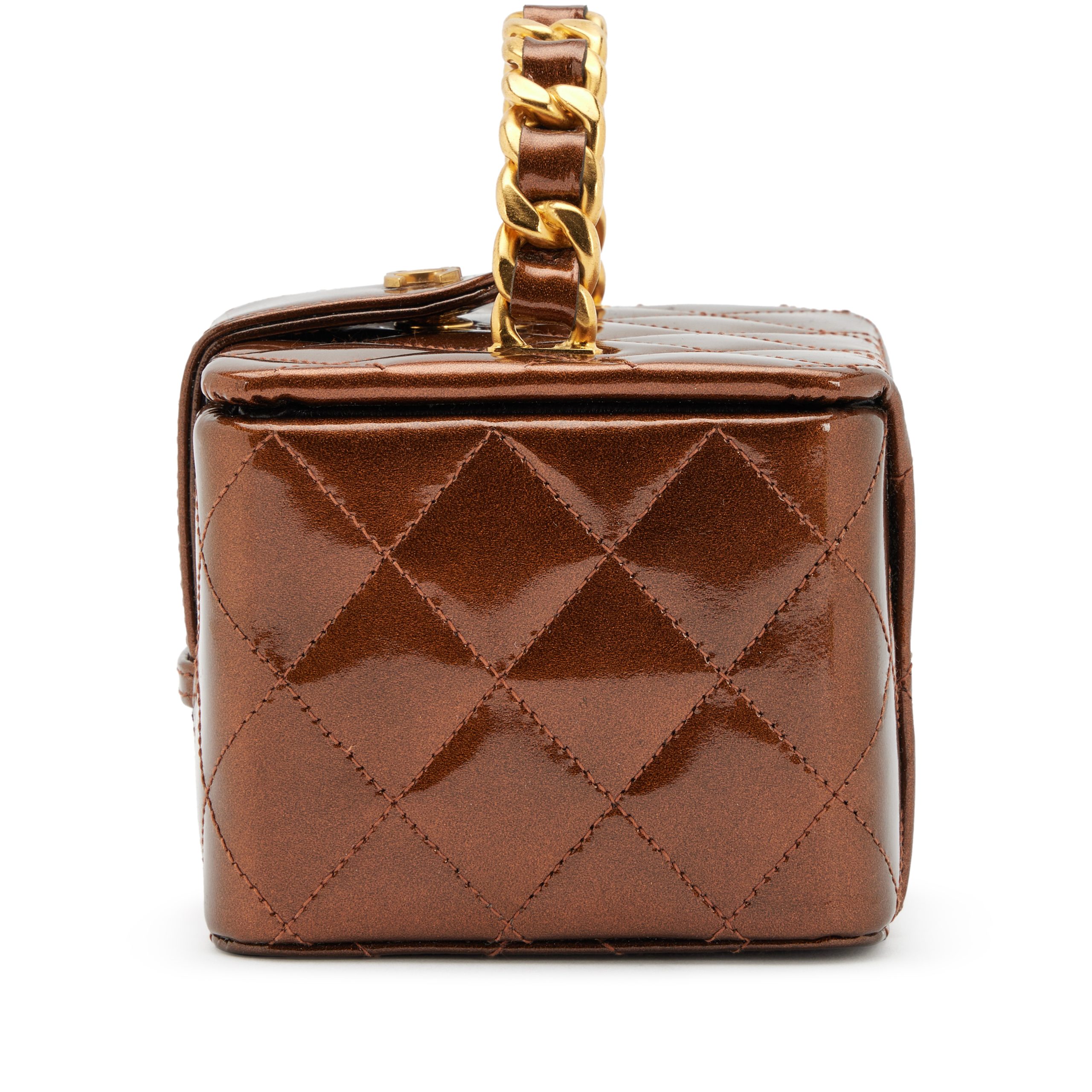 Chanel Metallic Bronze Quilted Patent Mini Square Vanity Case Bag Antique Gold Hardware, 1994-1996The interior is lined in a black leatherIncludes authenticity card, information booklet, dust bag, and boxThis item is final sale