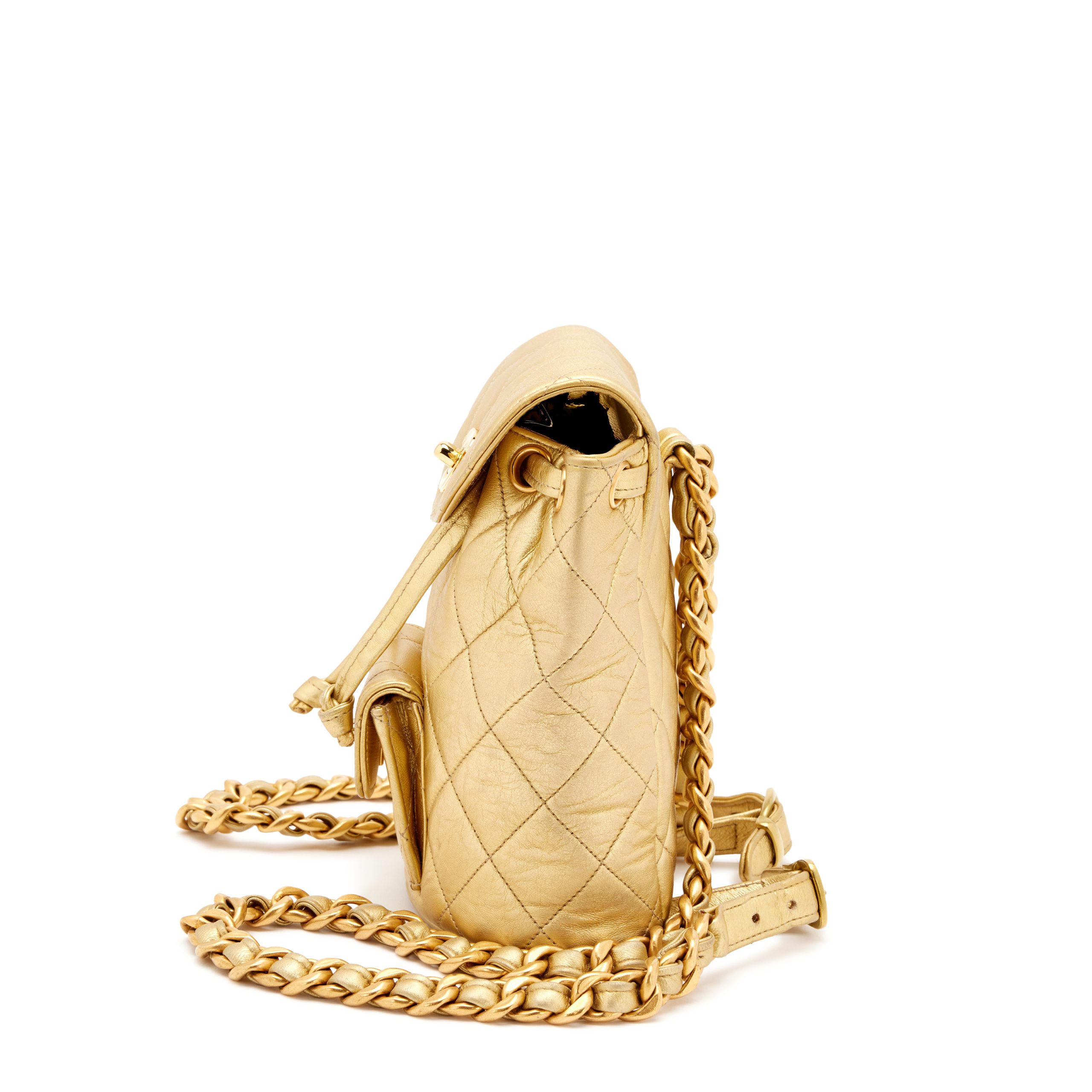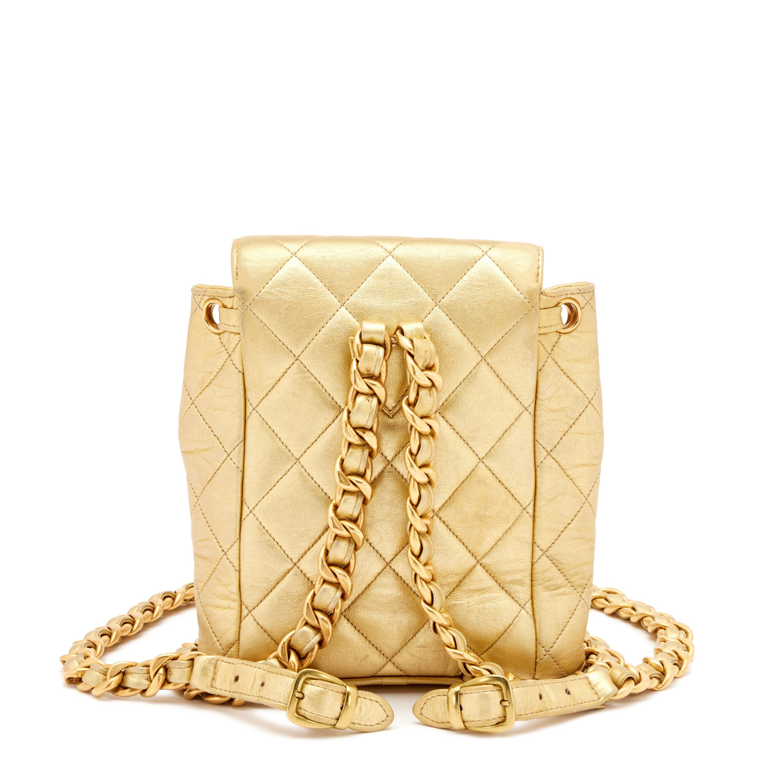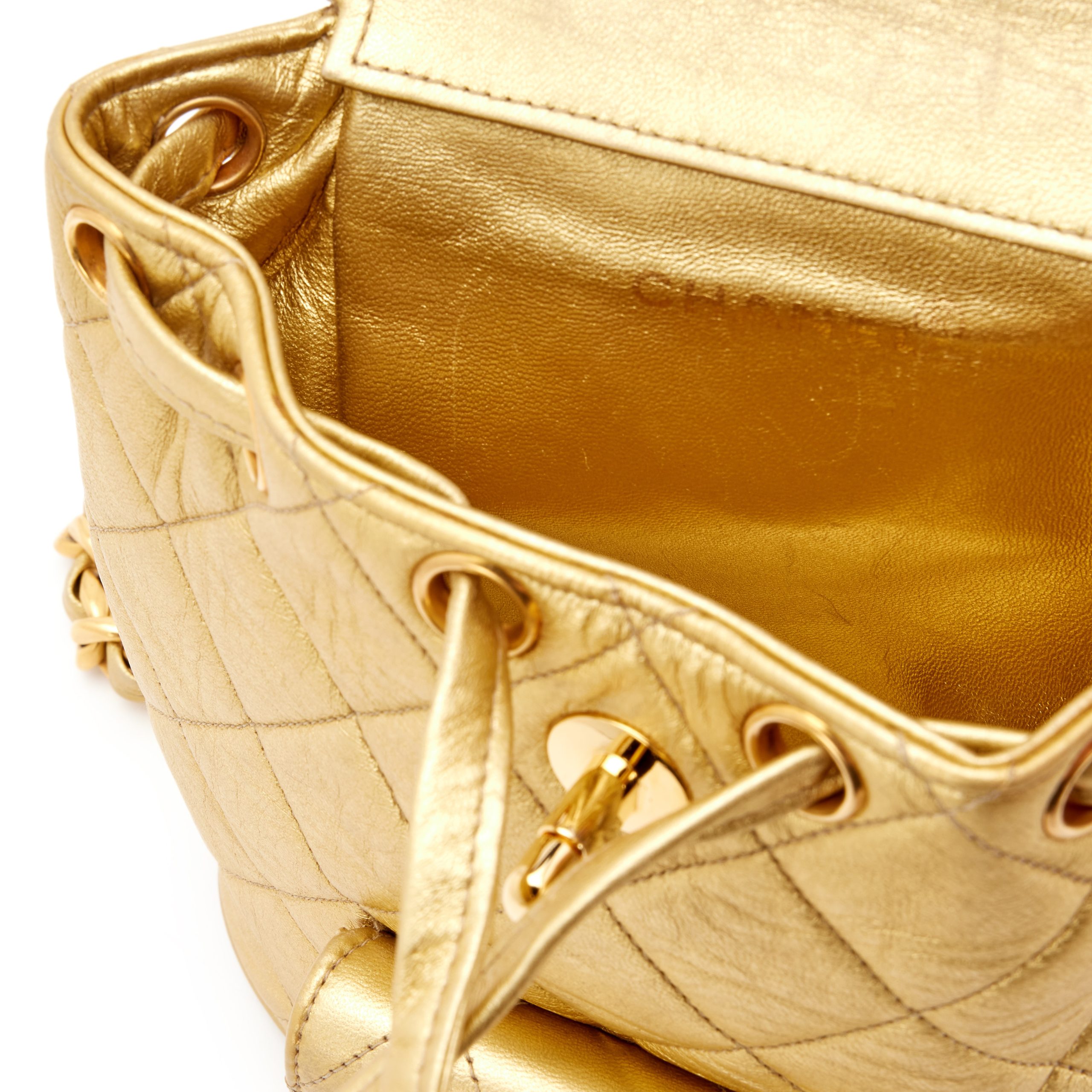 Chanel Metallic Gold Quilted Lambskin Mini Duma Timeless CC Backpack Gold Hardware, 1991-1994The interior is lined in a tonal leatherIncludes dust bagThis item is final sale