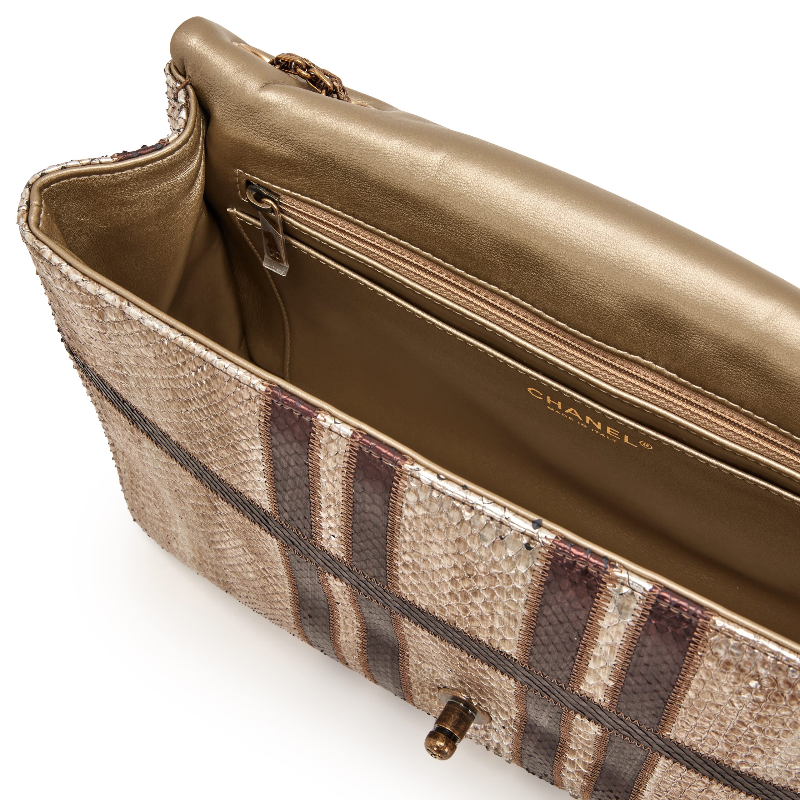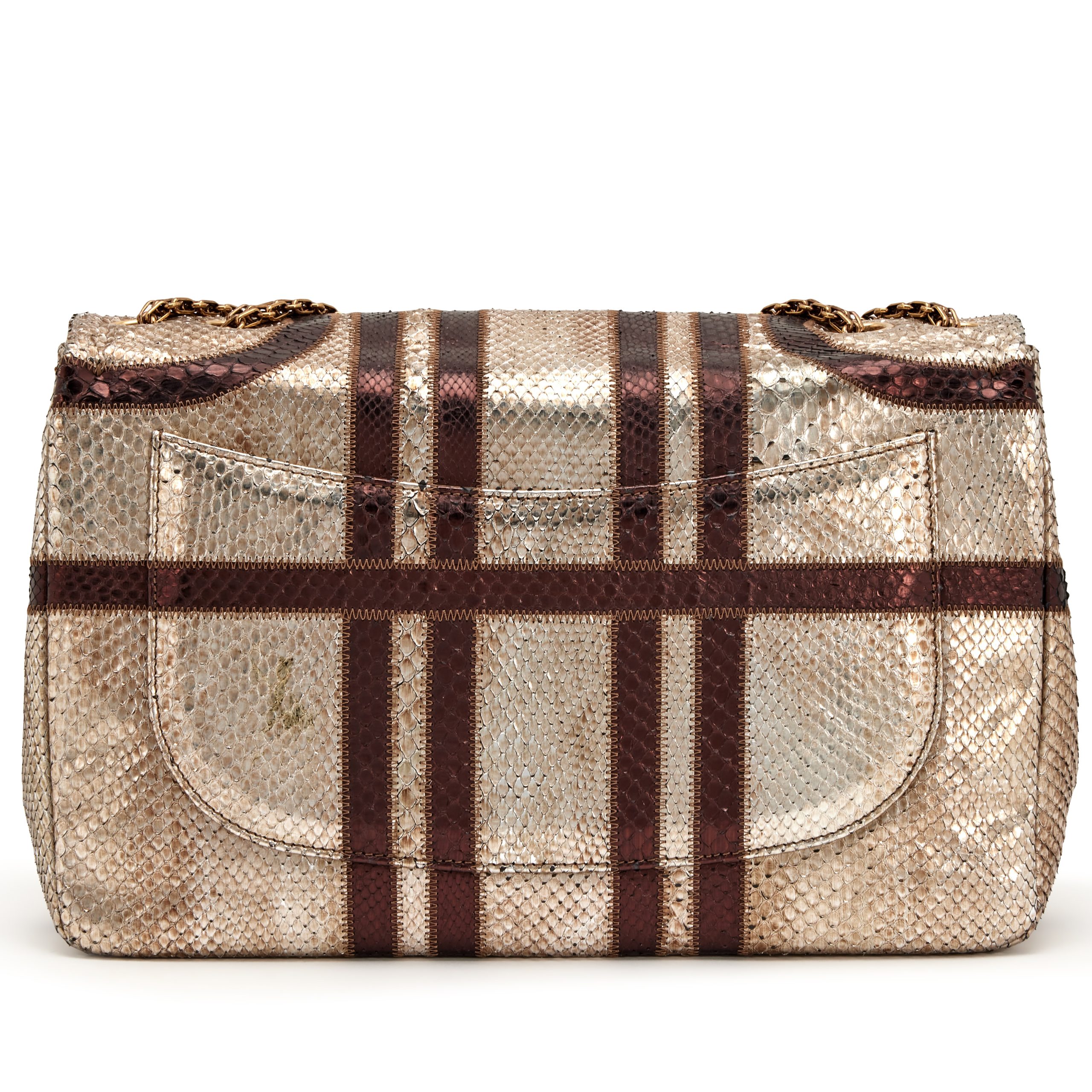 Chanel Metallic Python Paris Bombay Large Classic Single Flap Bag Aged Gold Hardware, 2012The interior is lined in a bronze leatherIncludes authenticity card, care booklet, dust bag, and boxAged Gold finish to hardware is inherent to the designThis item is final sale