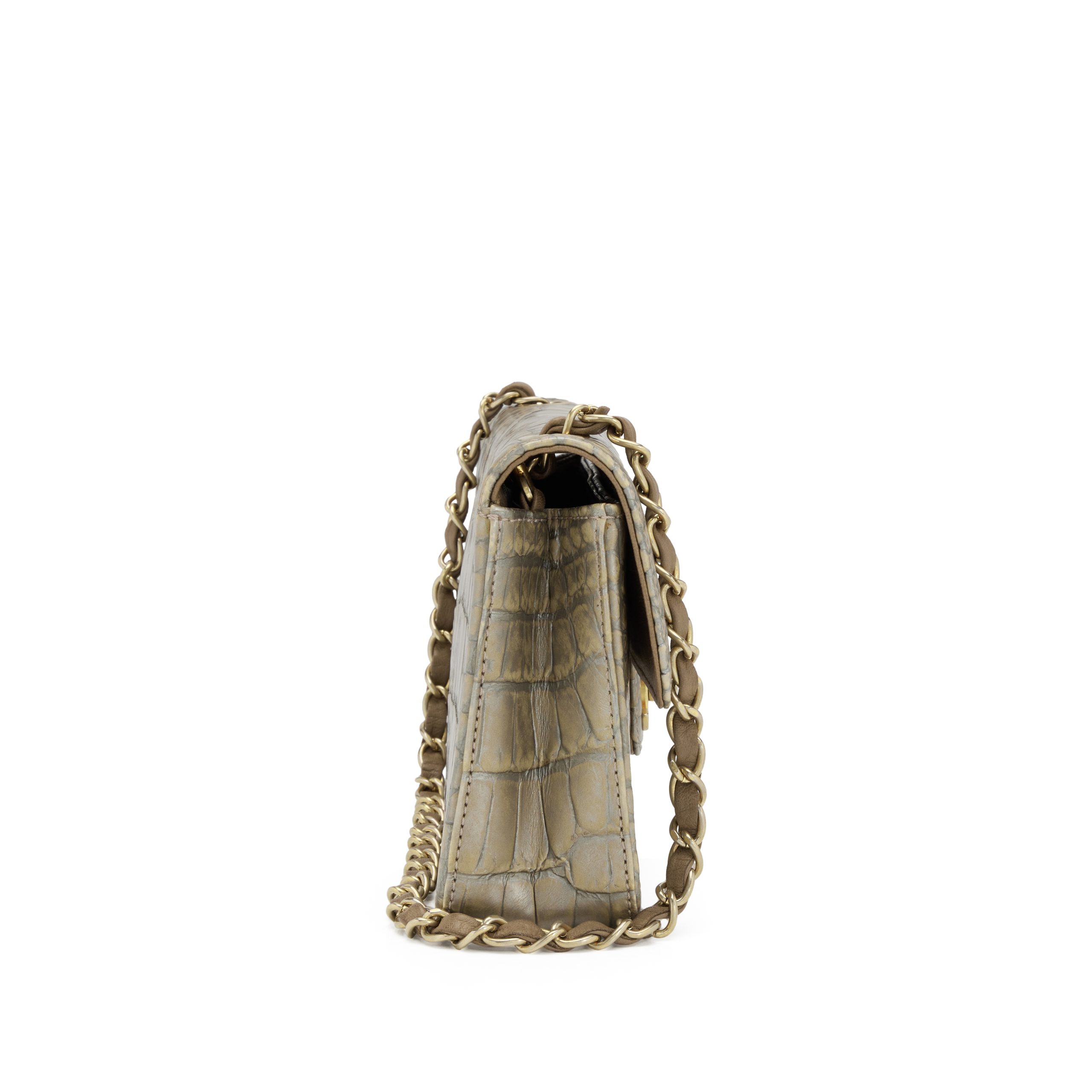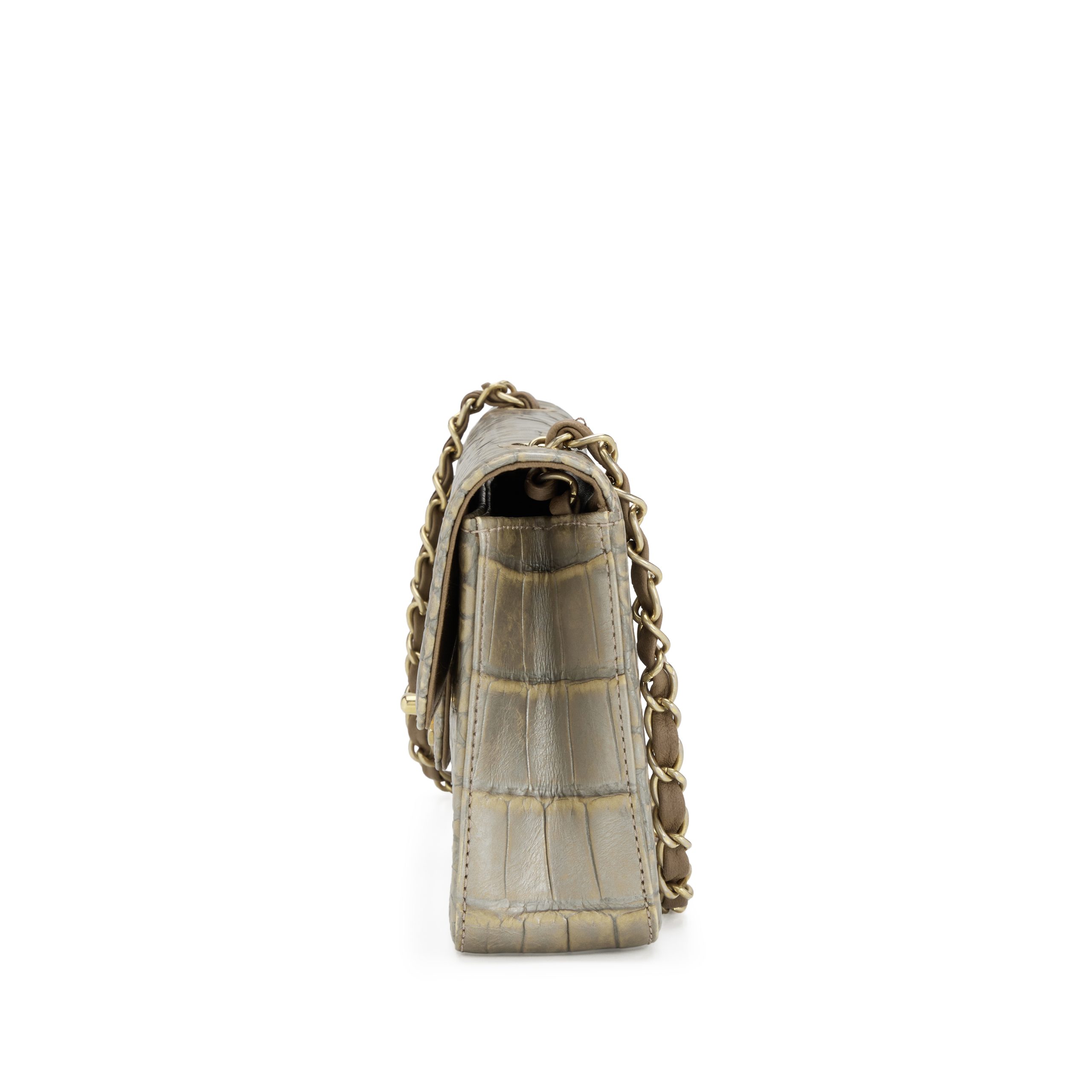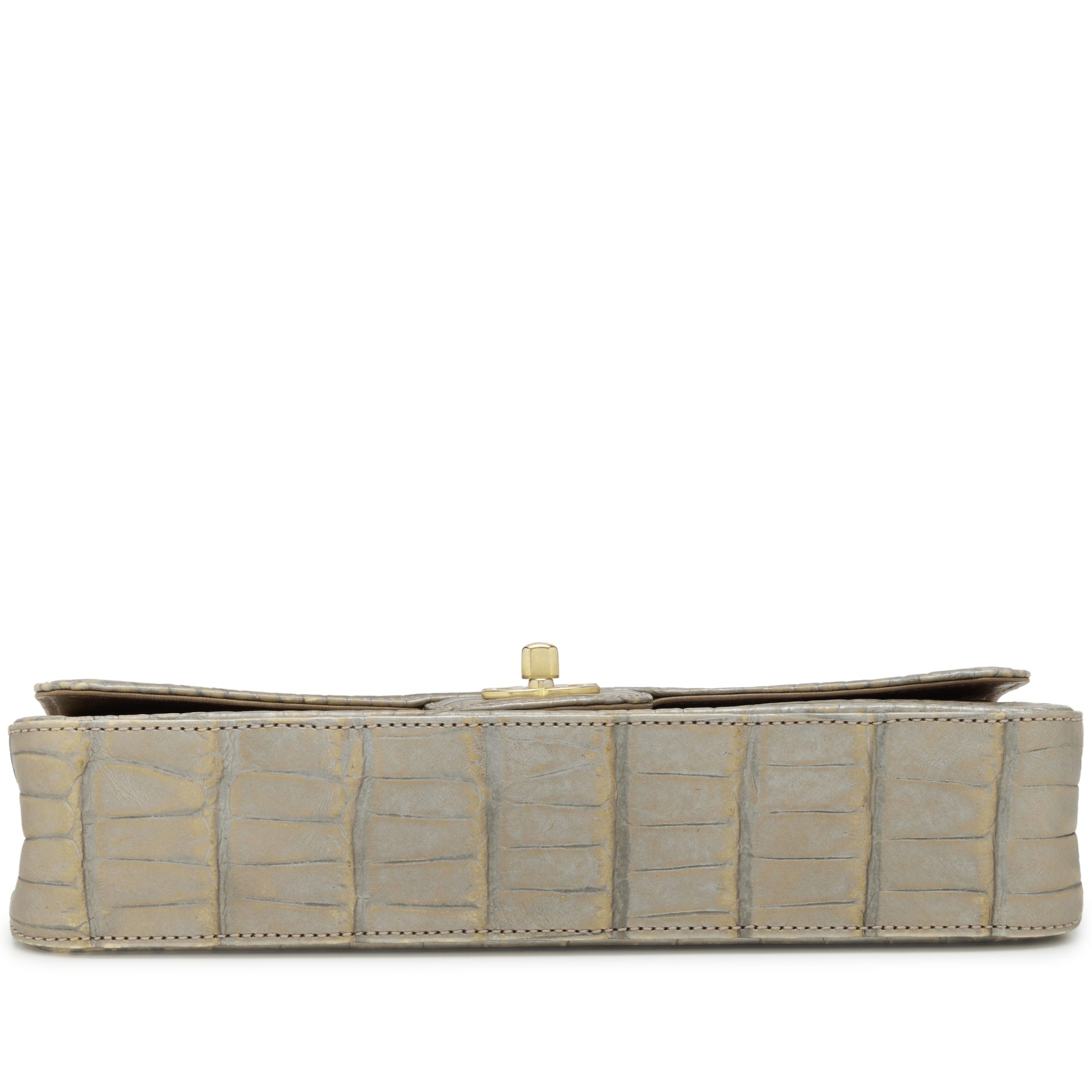Chanel Metallic Silver and Taupe Alligator East West Classic Flap Bag Aged Gold Hardware, 2008The interior is lined in a brown leatherIncludes information booklet, felt protector, dust bag and boxThis item is final sale