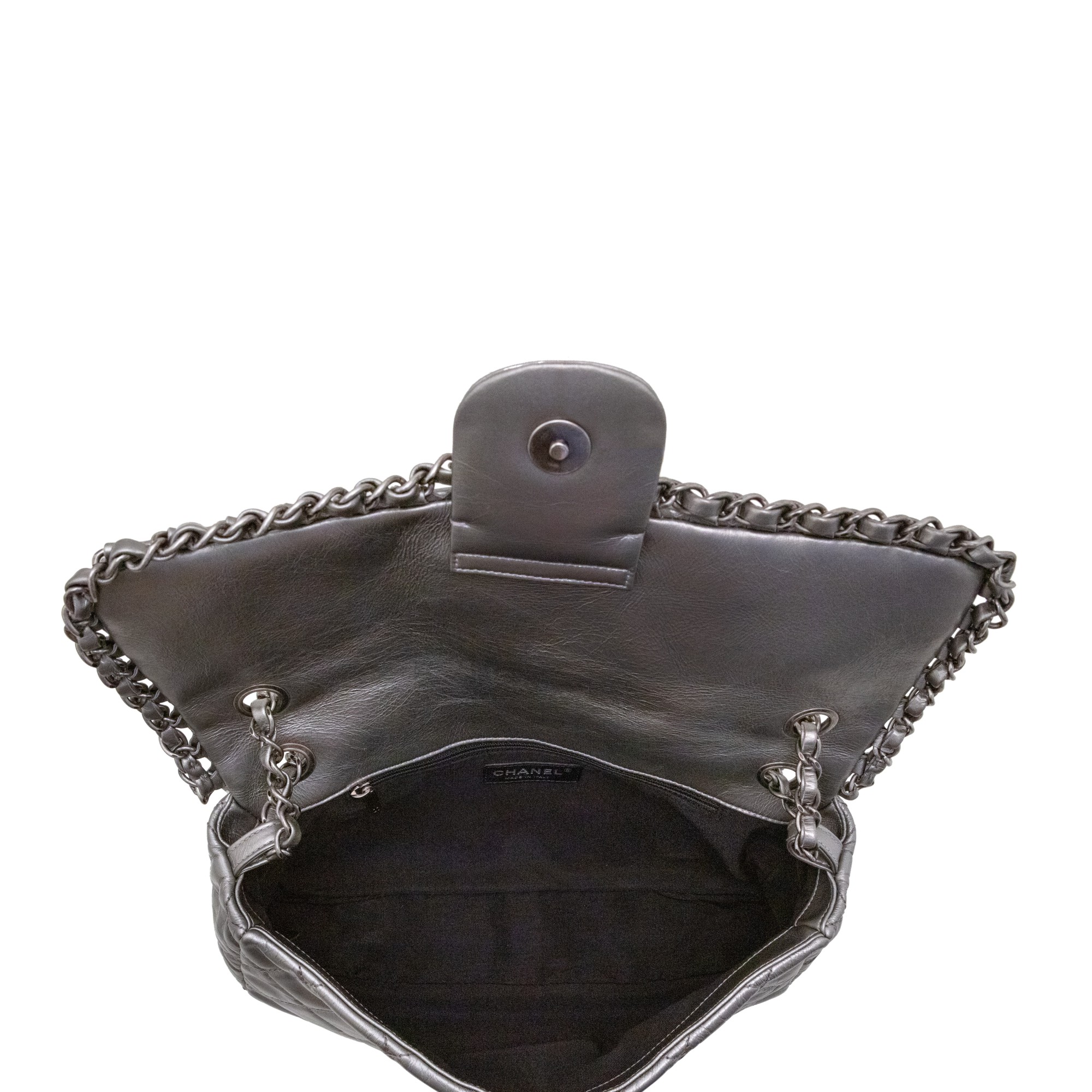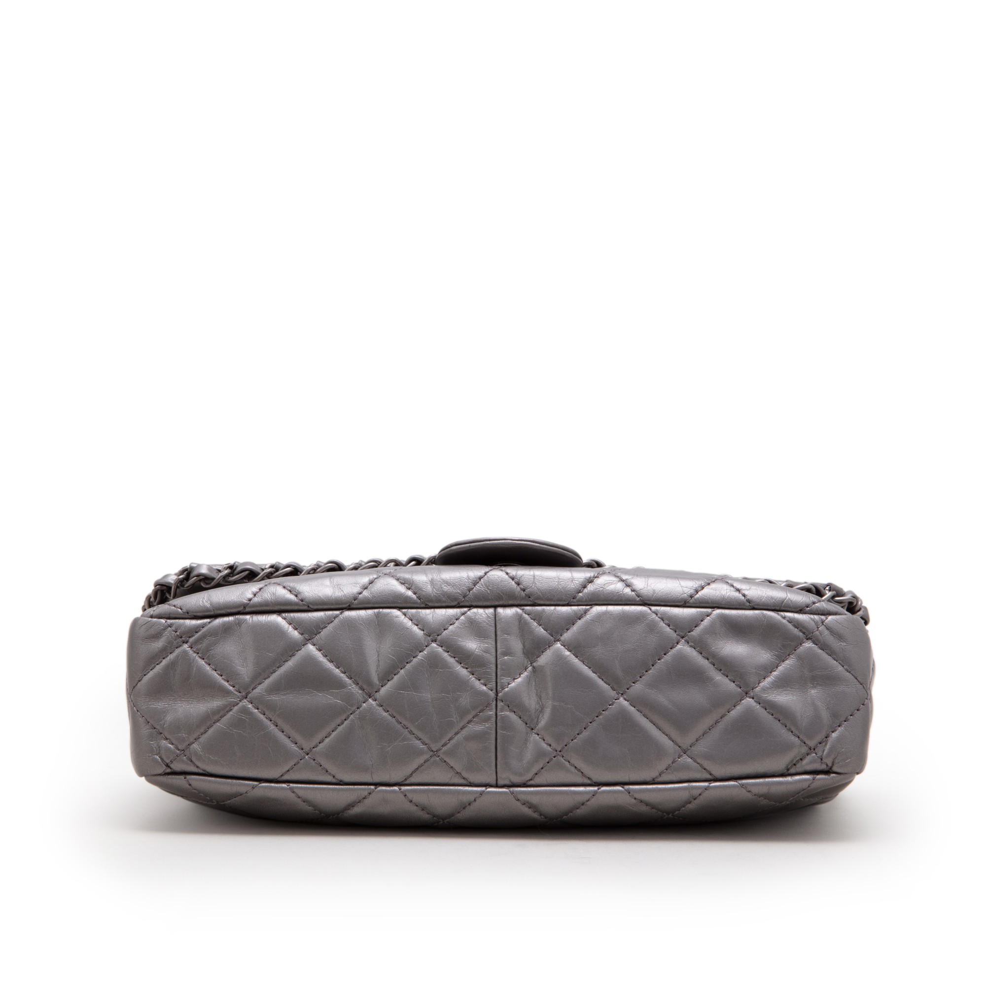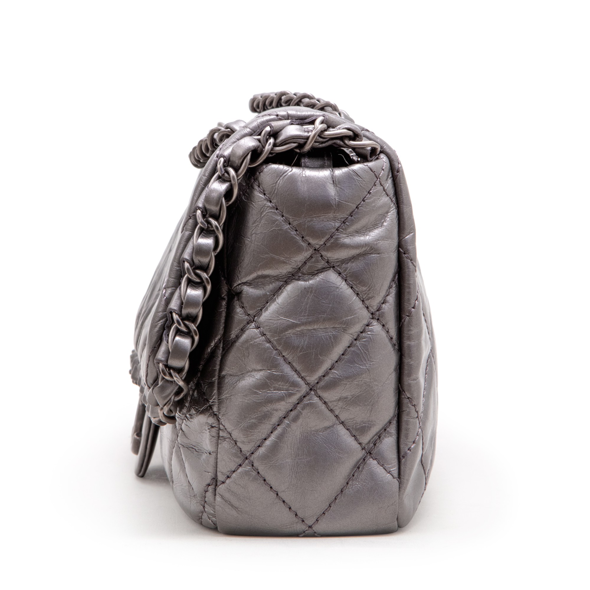 Chanel Metallic Silver Quilted Aged Calfskin Jumbo Chain Single Flap Ruthenium Hardware, 2012The interior is lined in black textile materialThis item is final sale