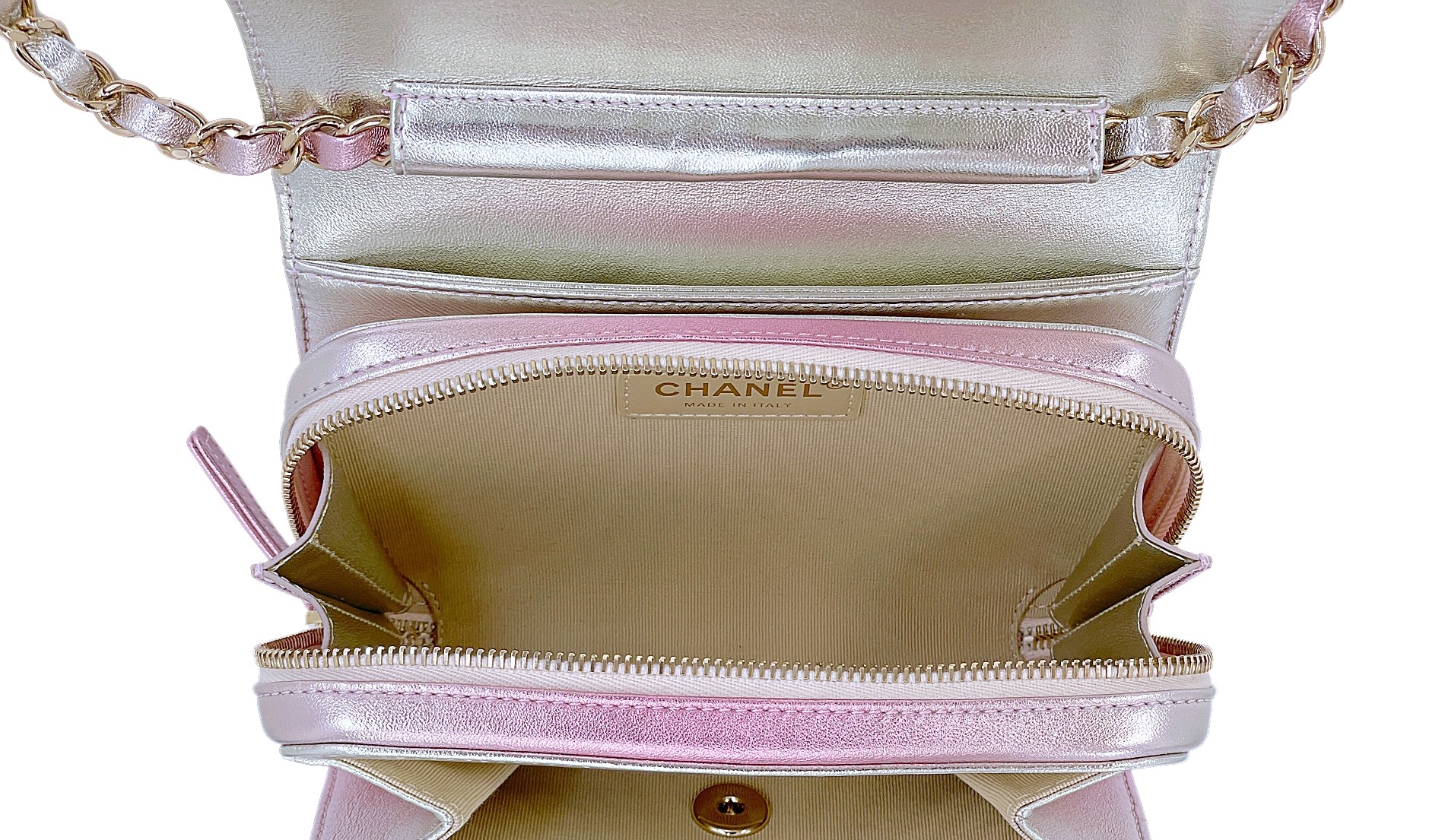 Chanel Pink Lavender Metallic Ombre Lambskin Wallet Mini Flap Bag Gold HardwareThe interior is lined with beige canvasIncludes care booklet and dust bagThis item is final sale