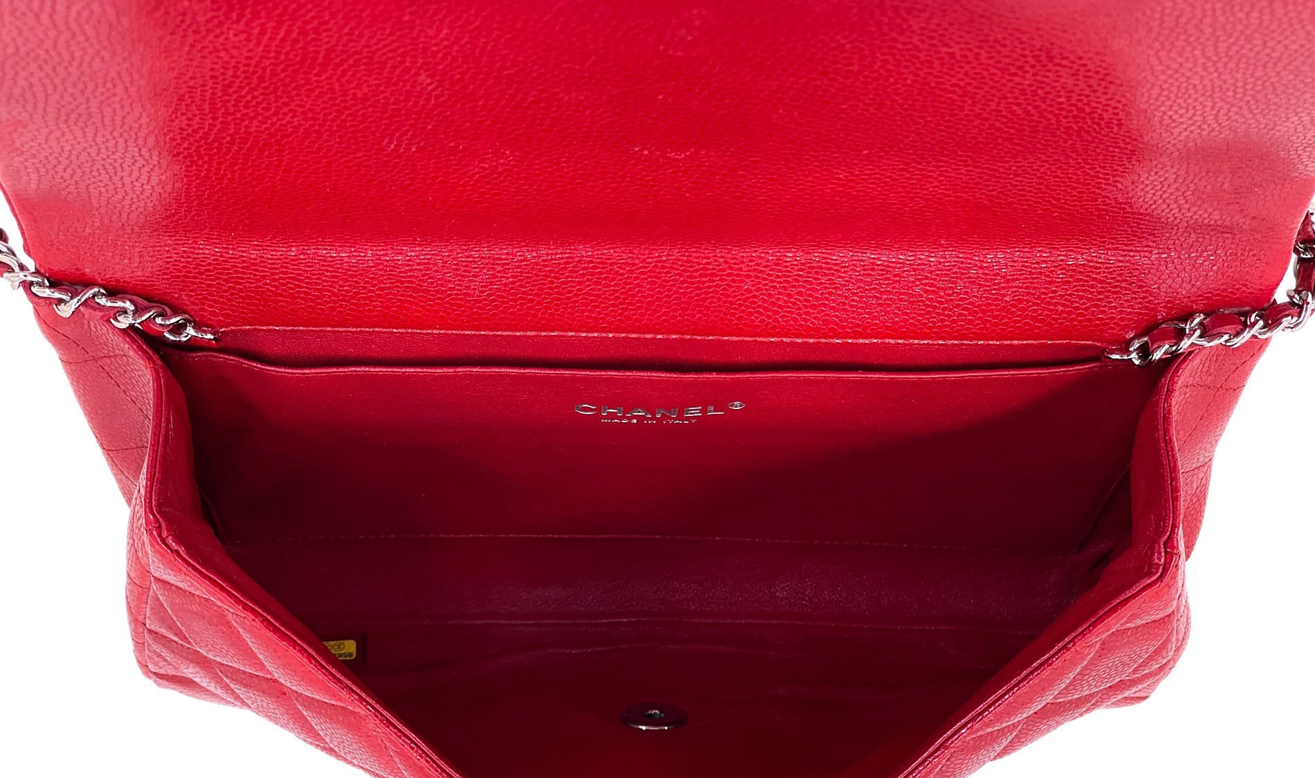 Chanel Red Quilted Caviar Timeless Classic Clutch on Chain Flap Bag Silver Hardware, 2012-2013The interior is lined in a tonal leatherIncludes authenticity card, care booklet, and dust bagThis item is final sale