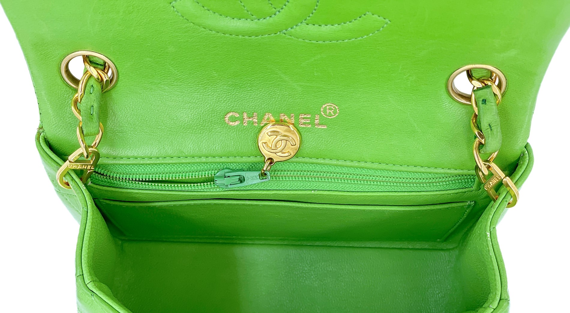 Chanel Vintage Apple Green Quilted Lambskin Mini Square Flap Bag Gold Hardware, 1989The interior is lined in a tonal leatherThis item is final sale