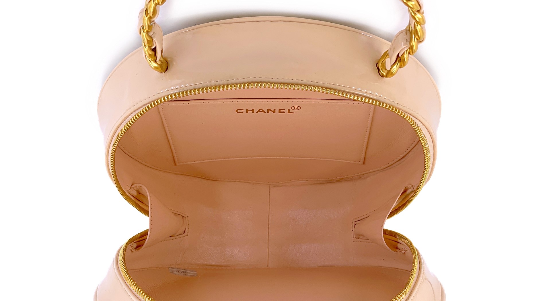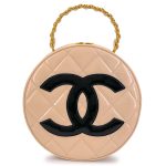 Chanel Vintage Beige Quilted Patent Barbie Round Vanity Case Gold Hardware, 1995The interior is lined in a tonal leatherThis item is final sale