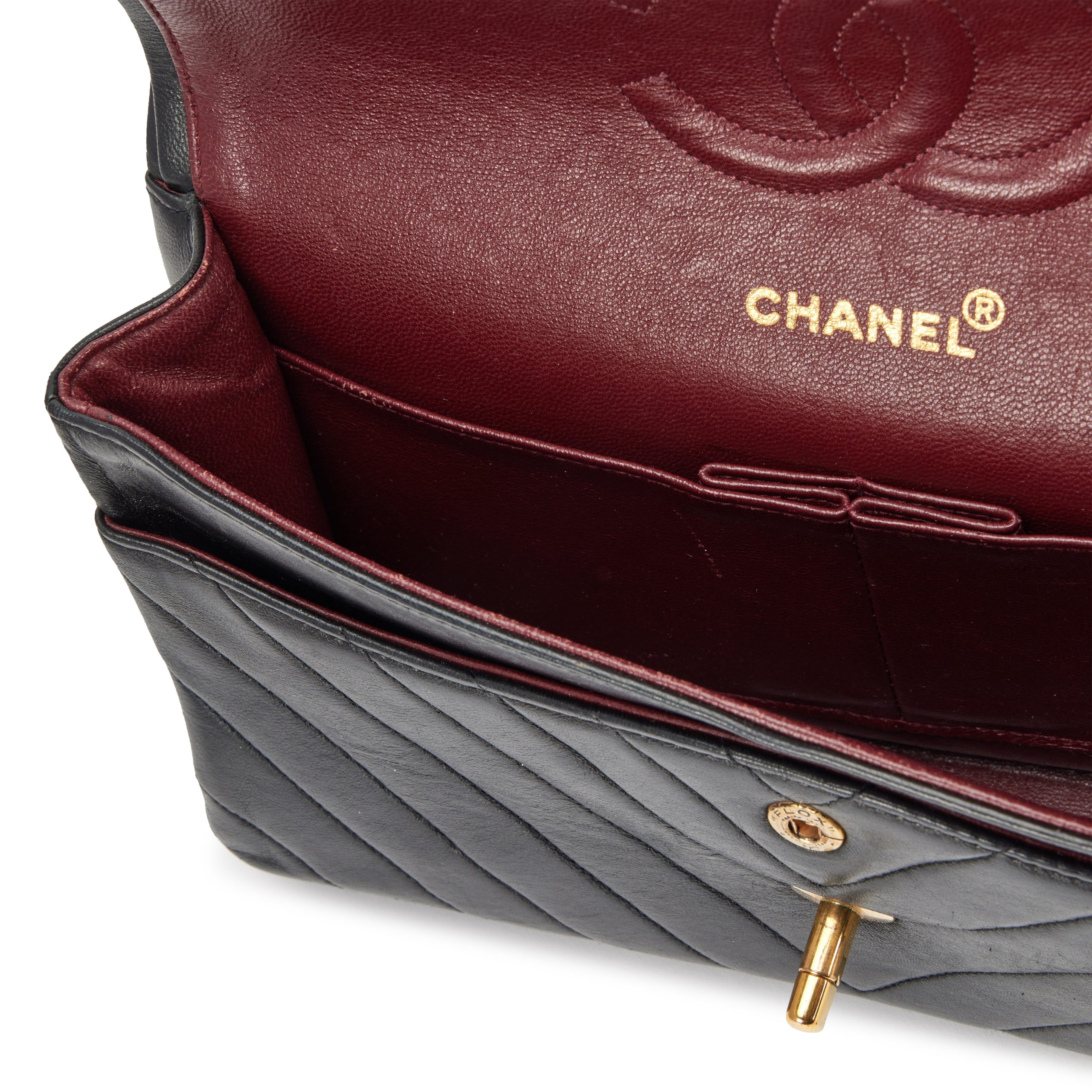 Chanel Vintage Black Quilted Chevron Lambskin Medium Double Flap Bag Gold Hardware, 1991-1994The interior is lined in a burgundy leatherIncludes dust bag and boxThis item is final sale