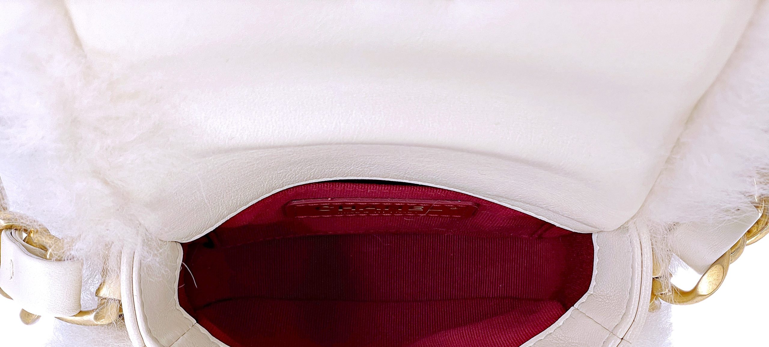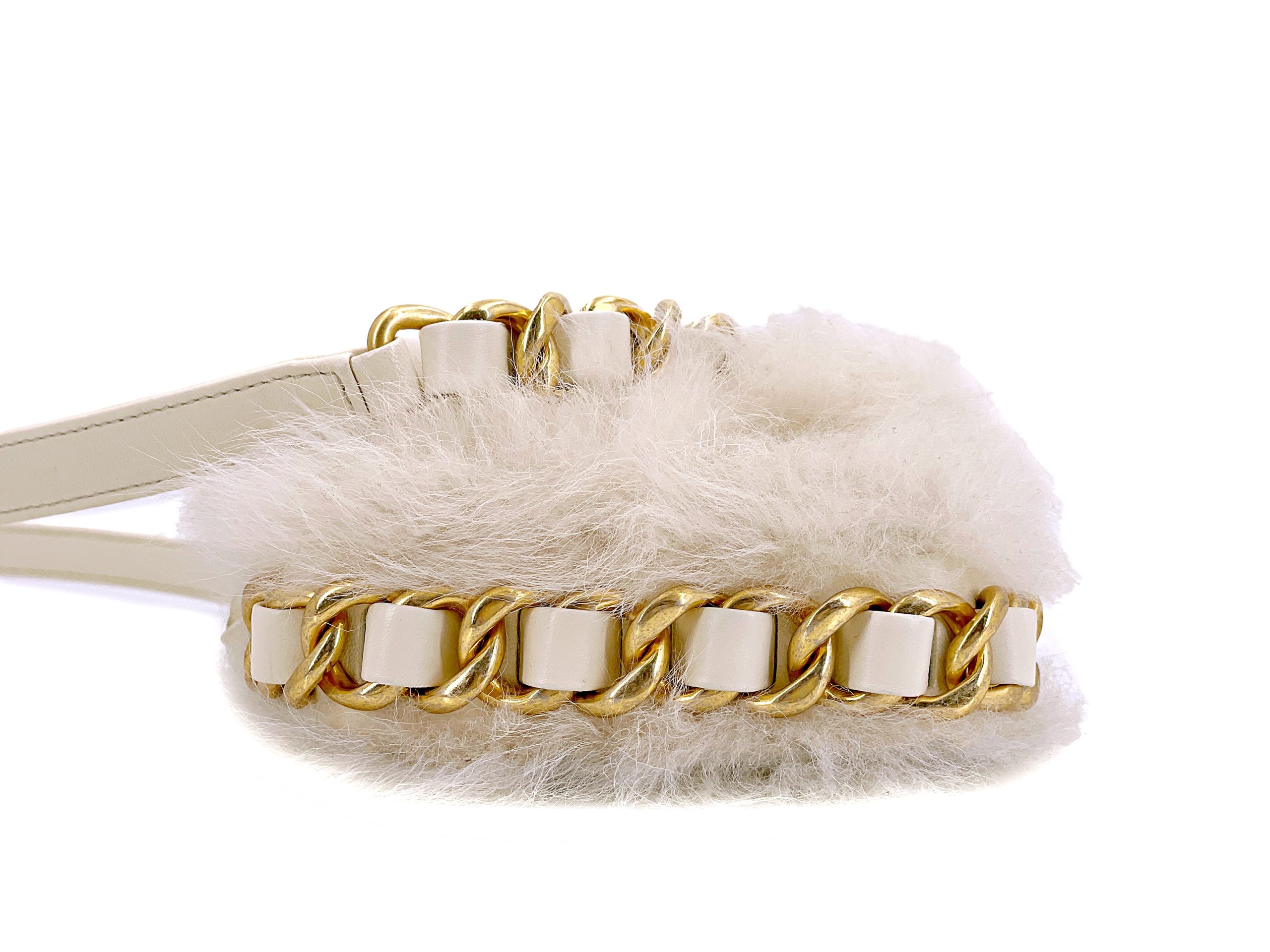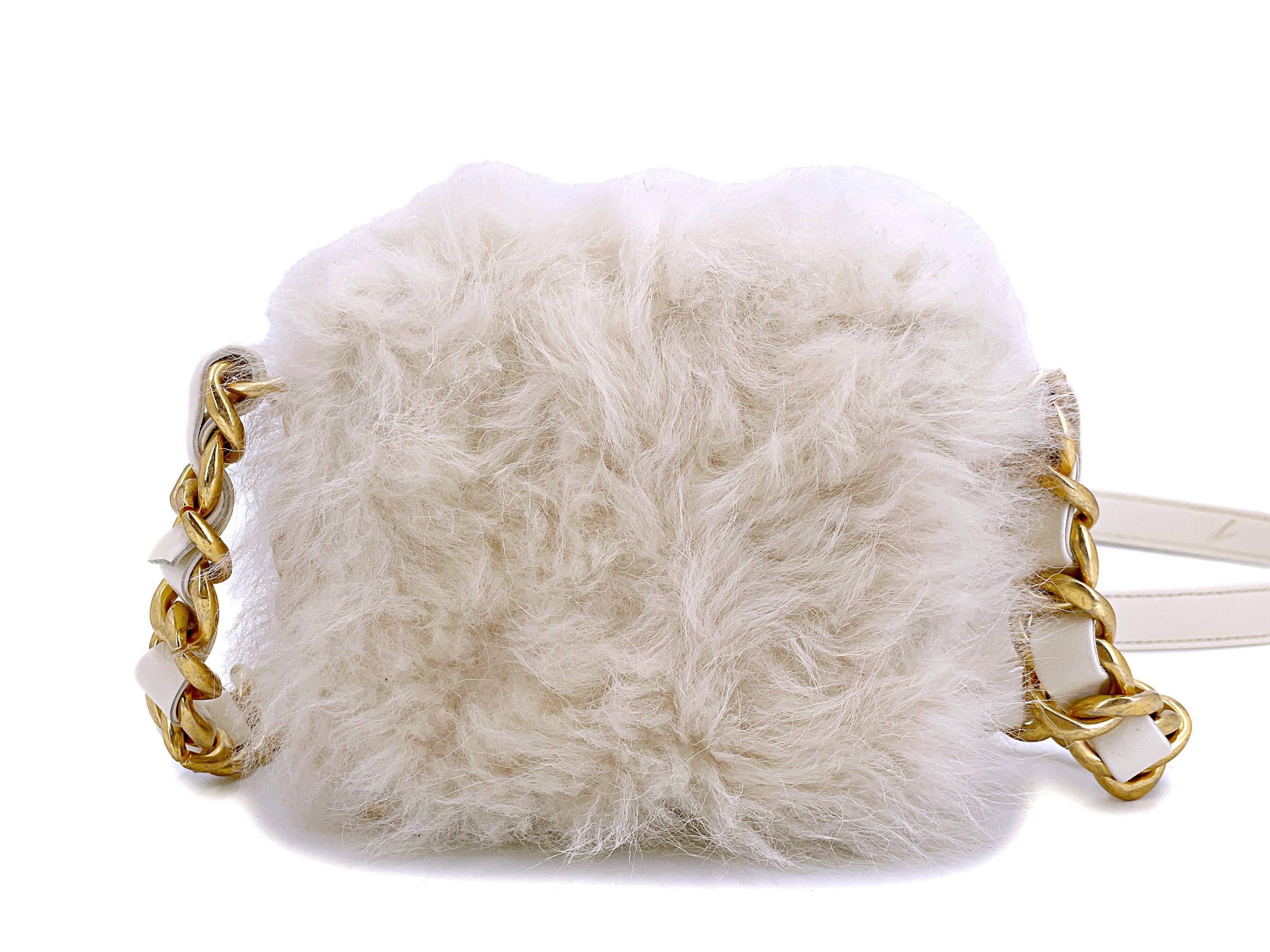 Chanel White Ivory Fur Faux Mini Crossbody Chunky Chain Flap Bag Aged Gold Hardware, 2021The interior is lined in a burgundy leatherIncludes care booklet, dust bag, and boxThis item is final sale
